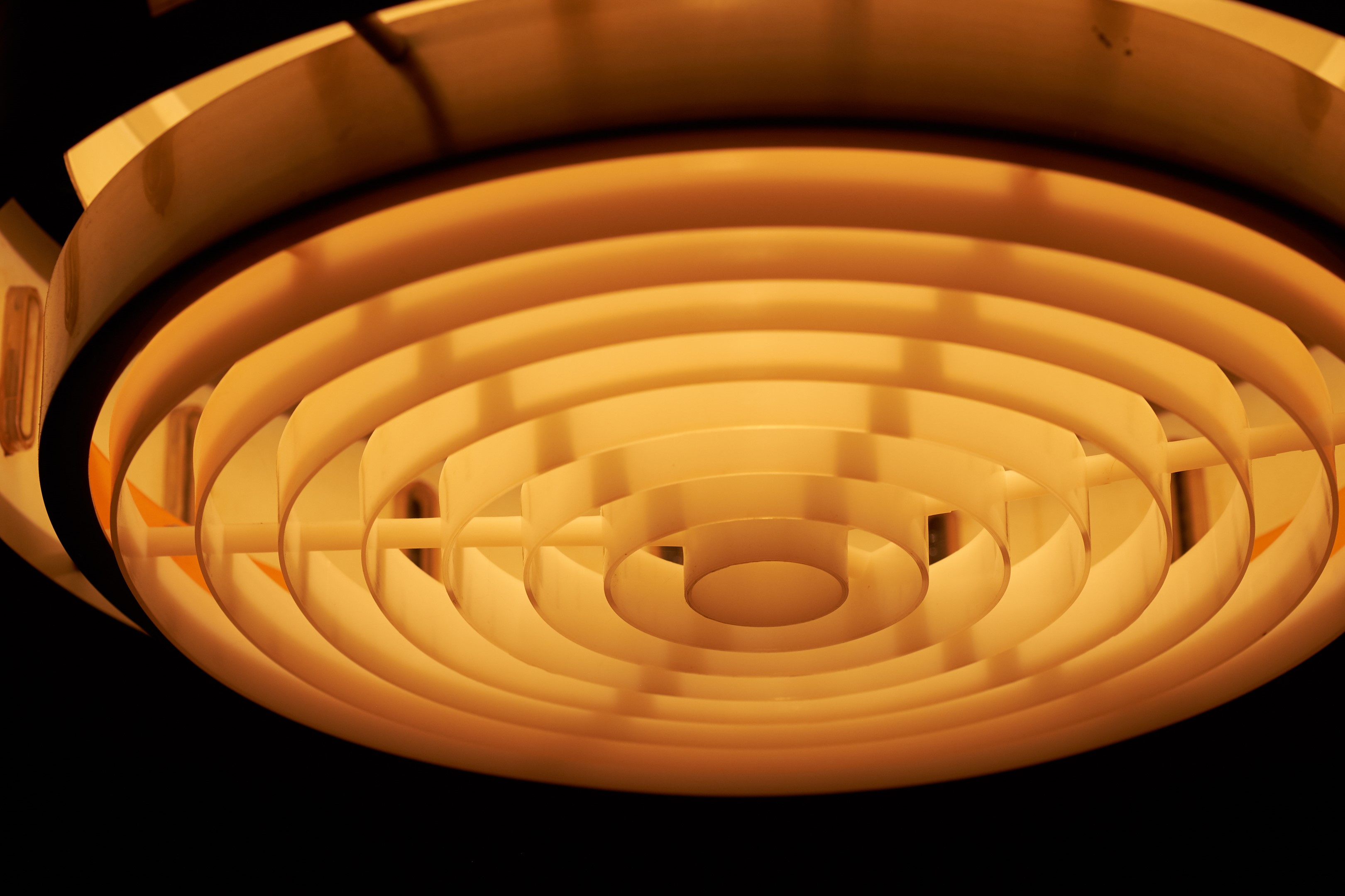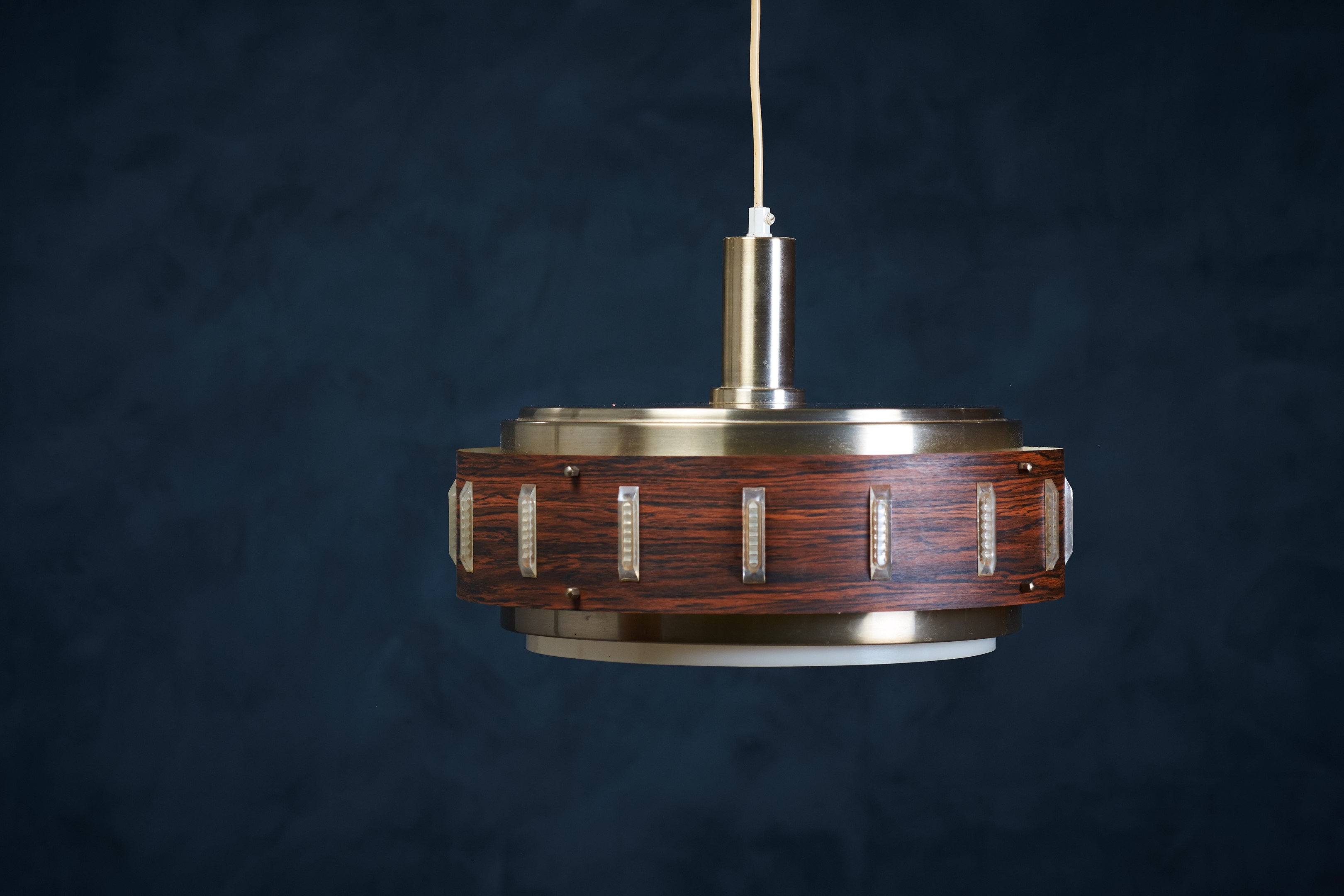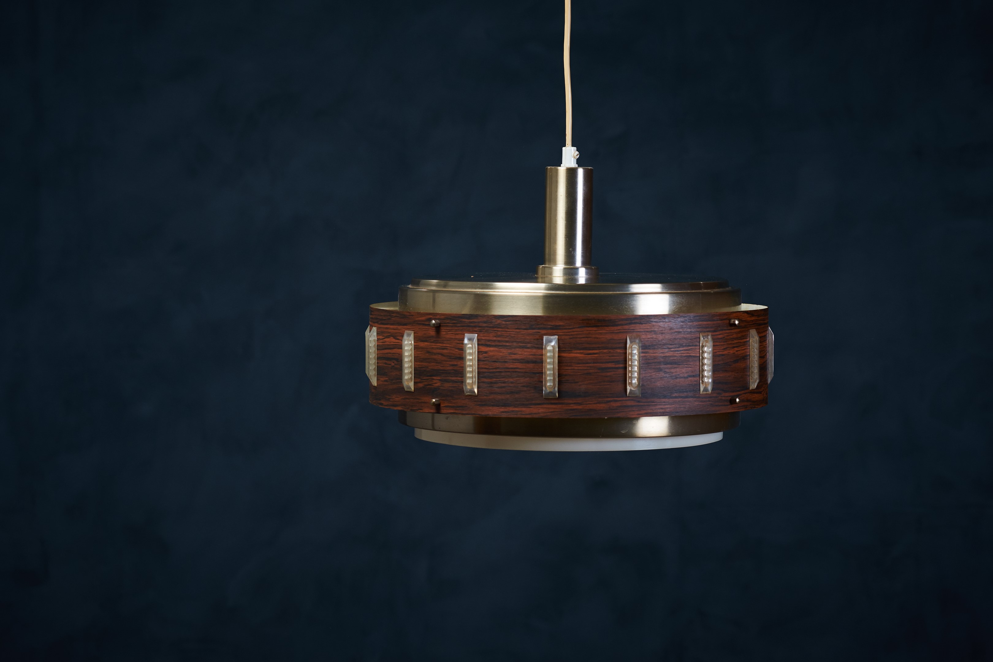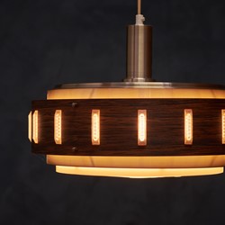 Stunning mid-century ceiling lamp with rosewood laminate on one of the shades. This lamp provides a nice and warm light and would fit in most modern environments.