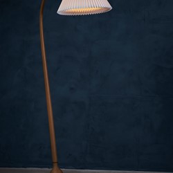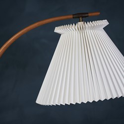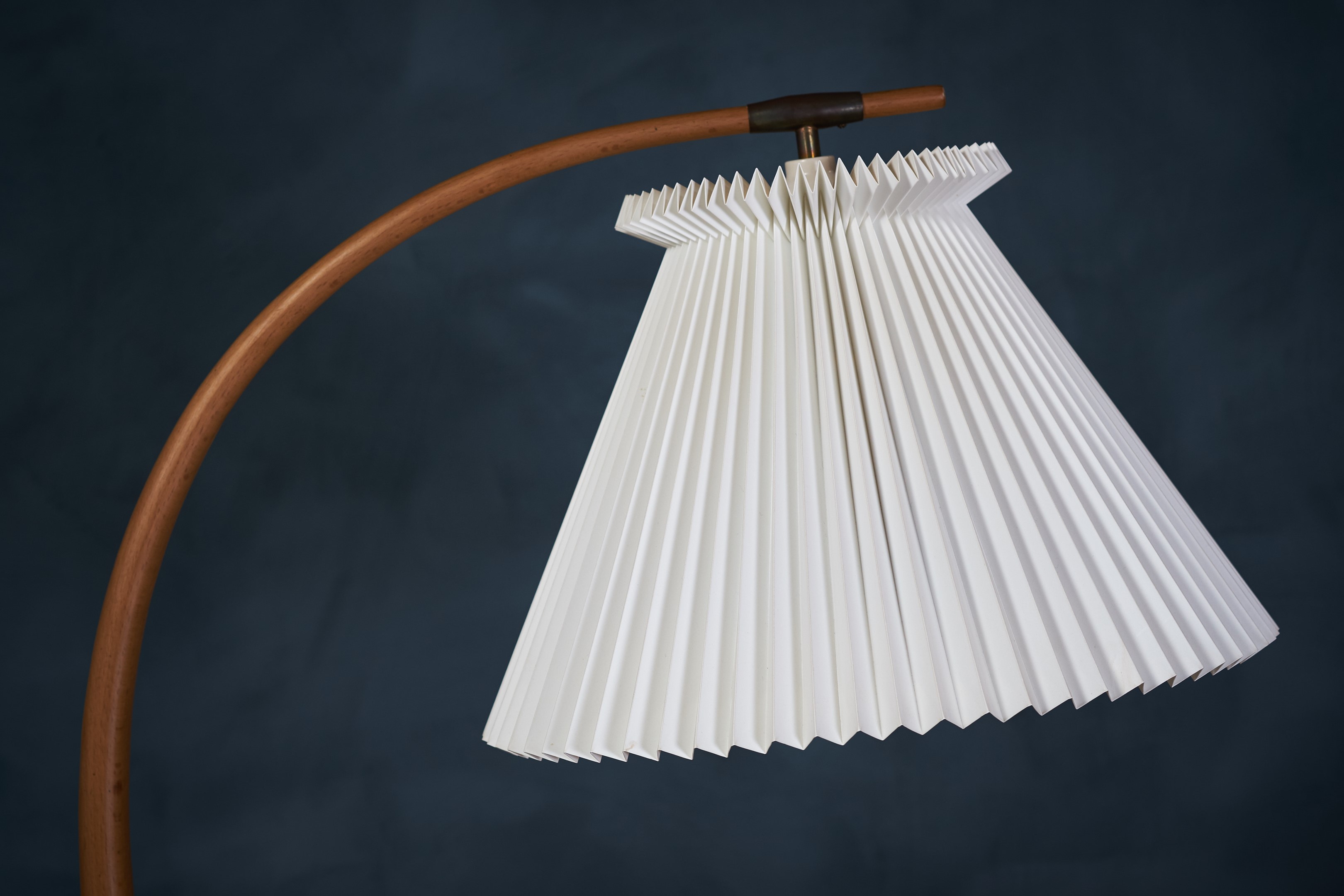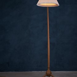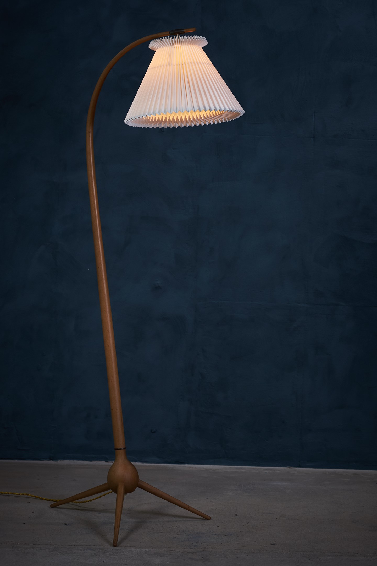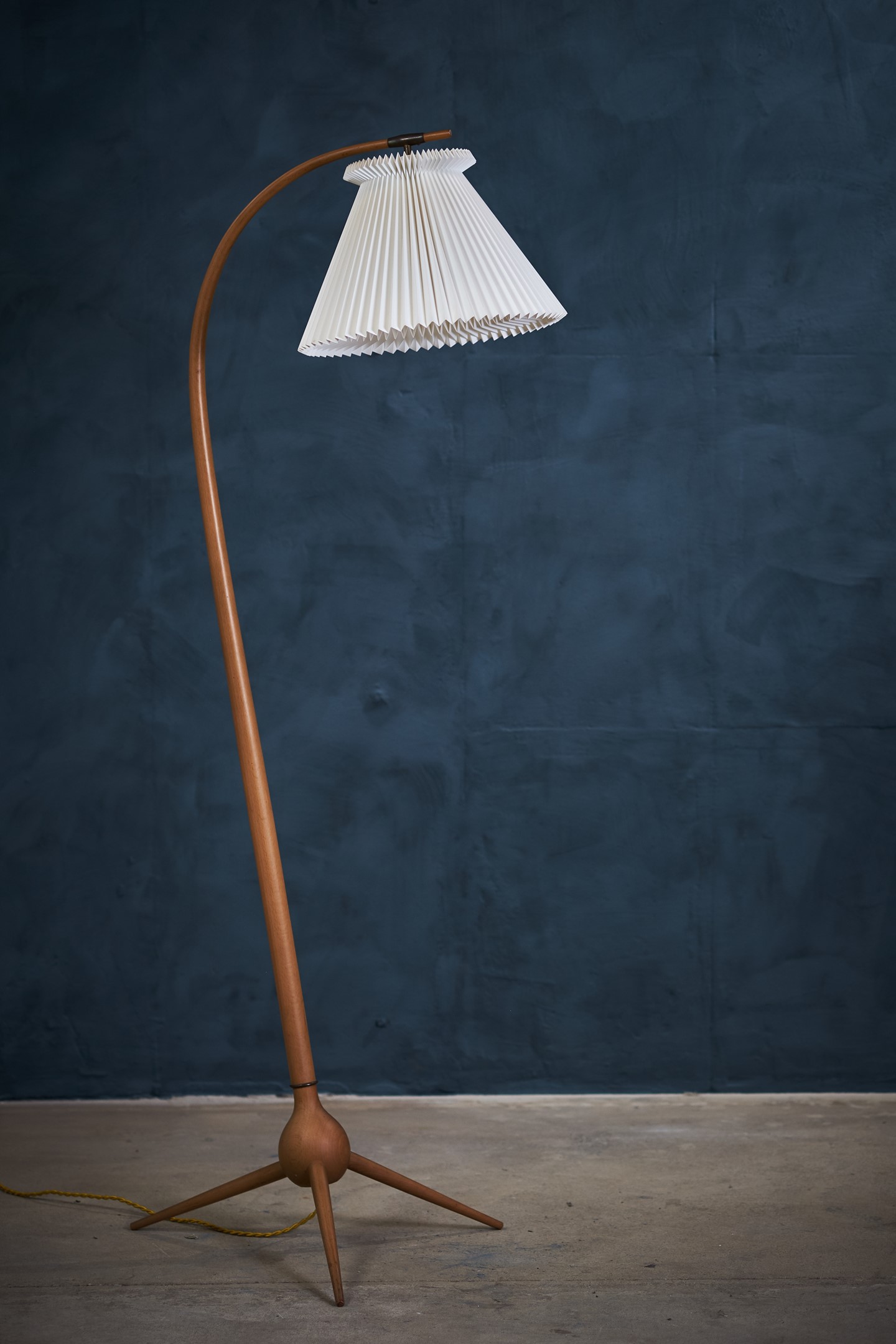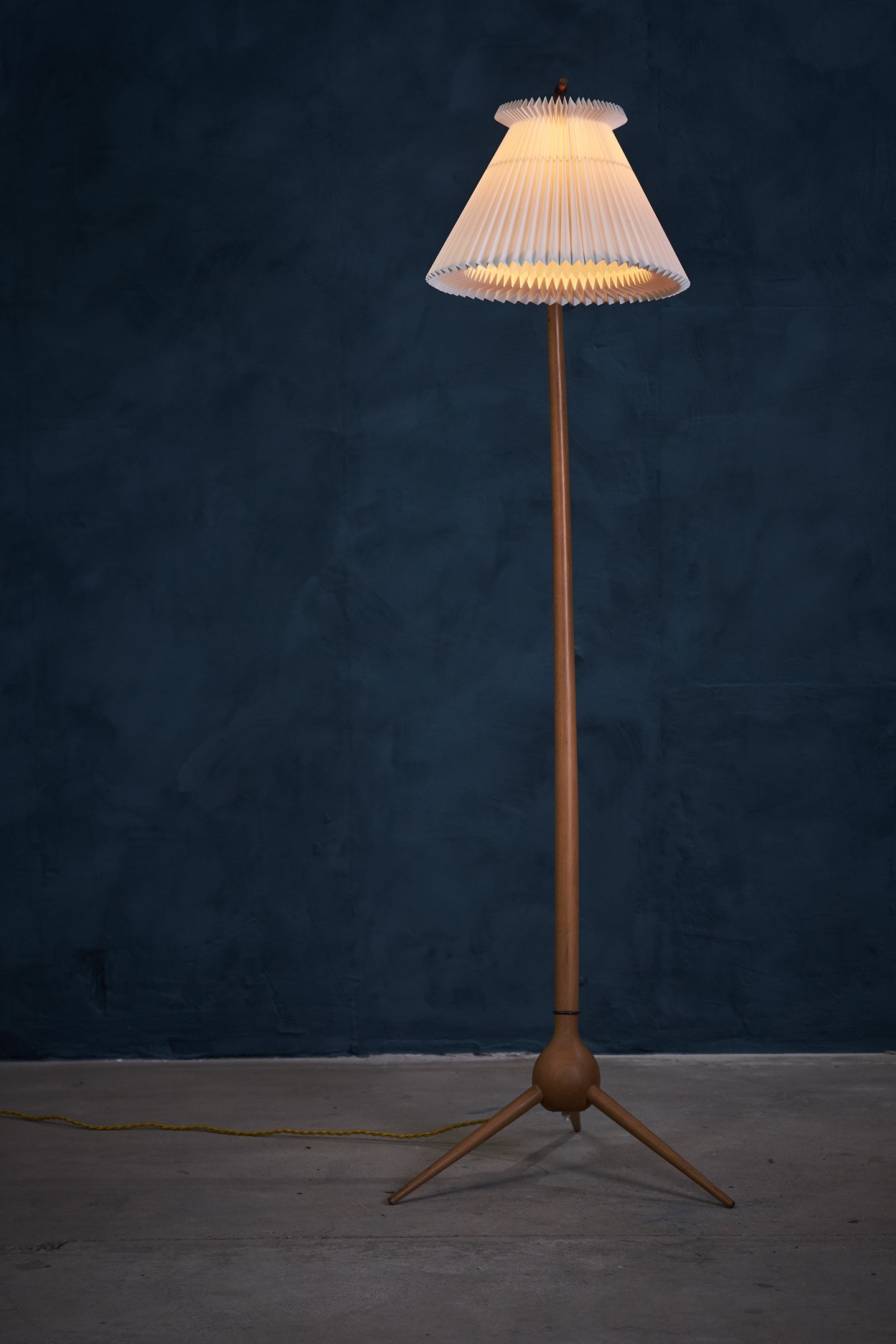 This lamp is made of beech with brass elements. The wire is beautifully hidden along the backside of the stem which is a very beautiful detail. The switch is found in between the tripod legs. The lamp comes with a Le Klint shade which is in great condition. The lamp is also in great condition.