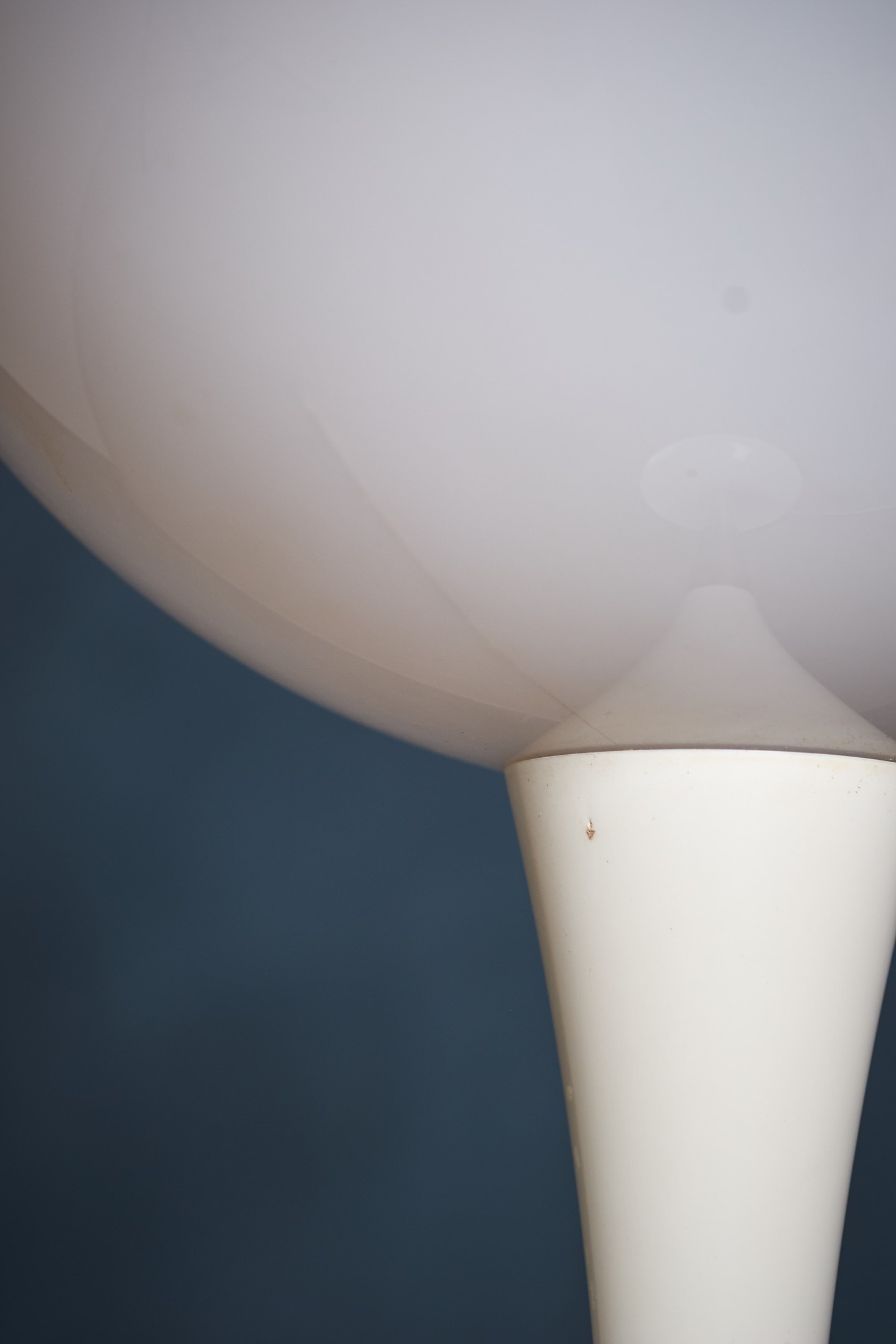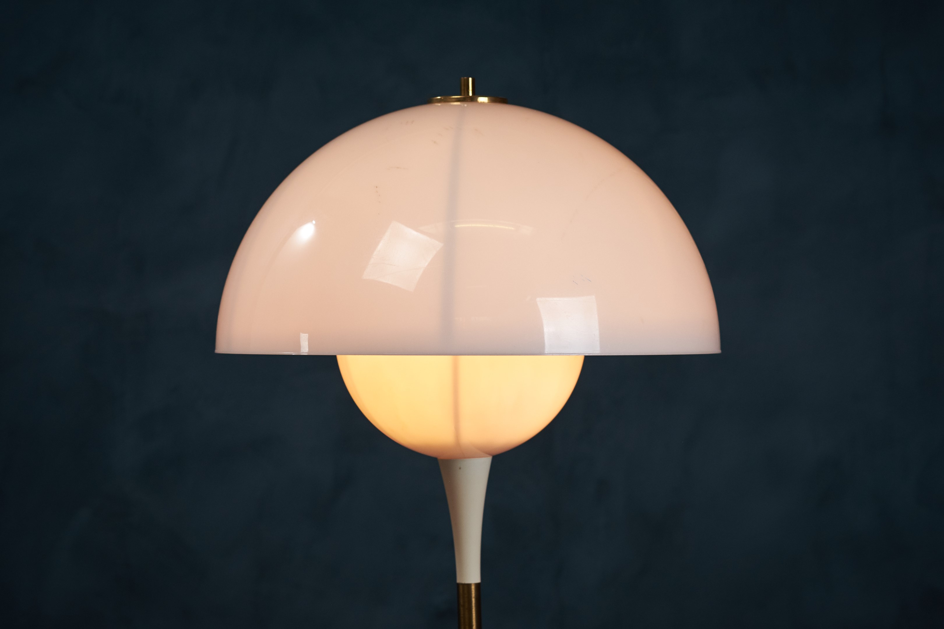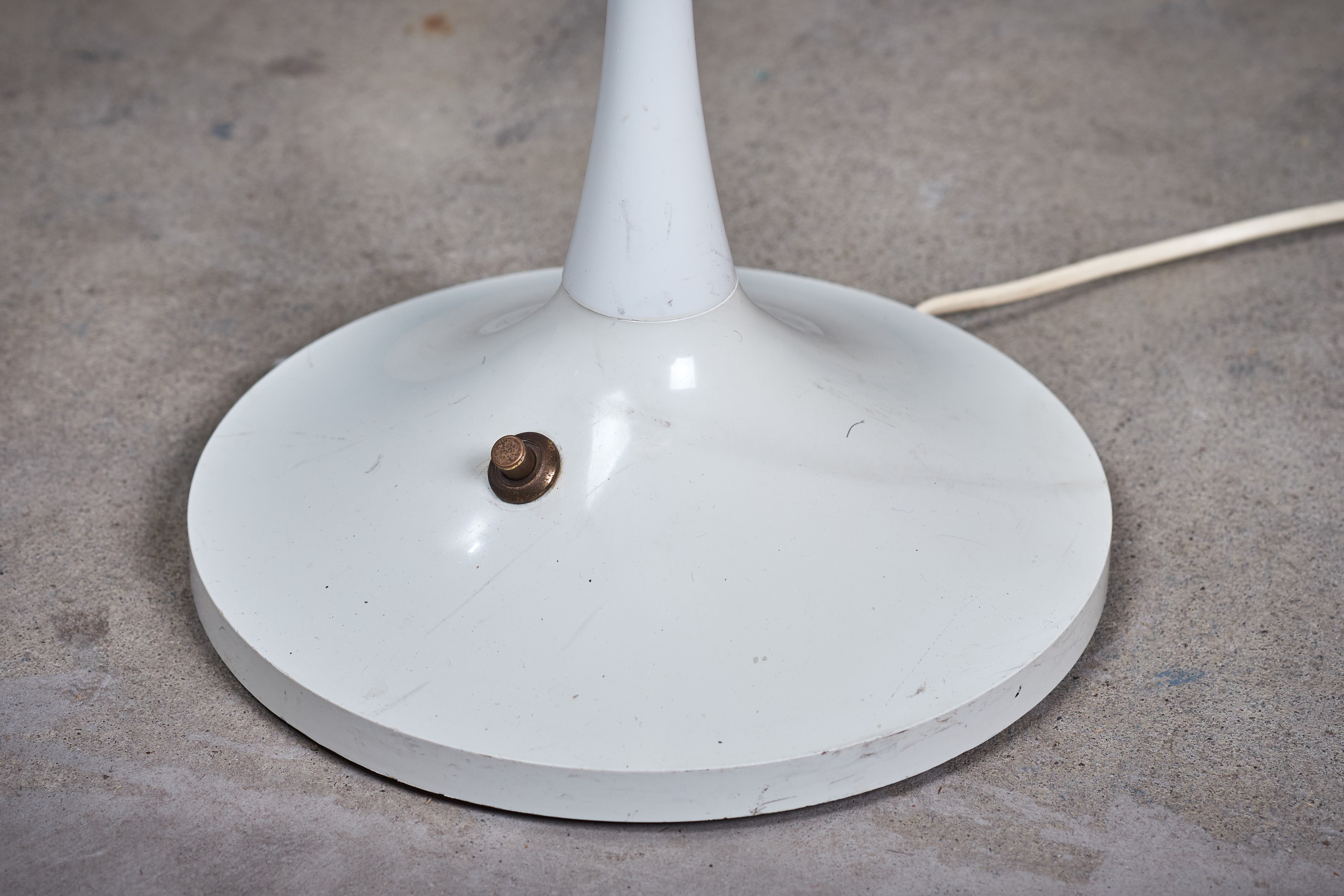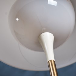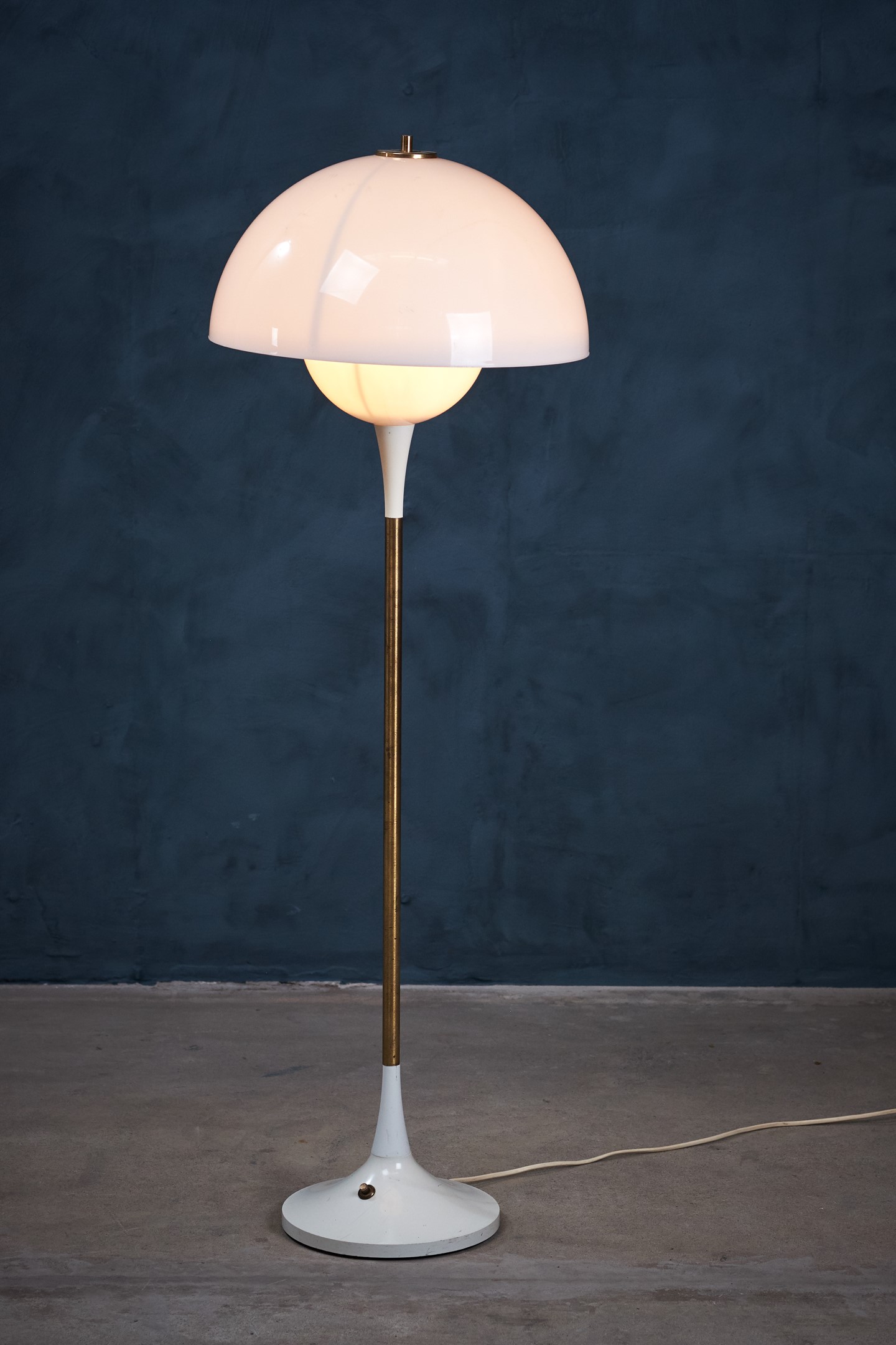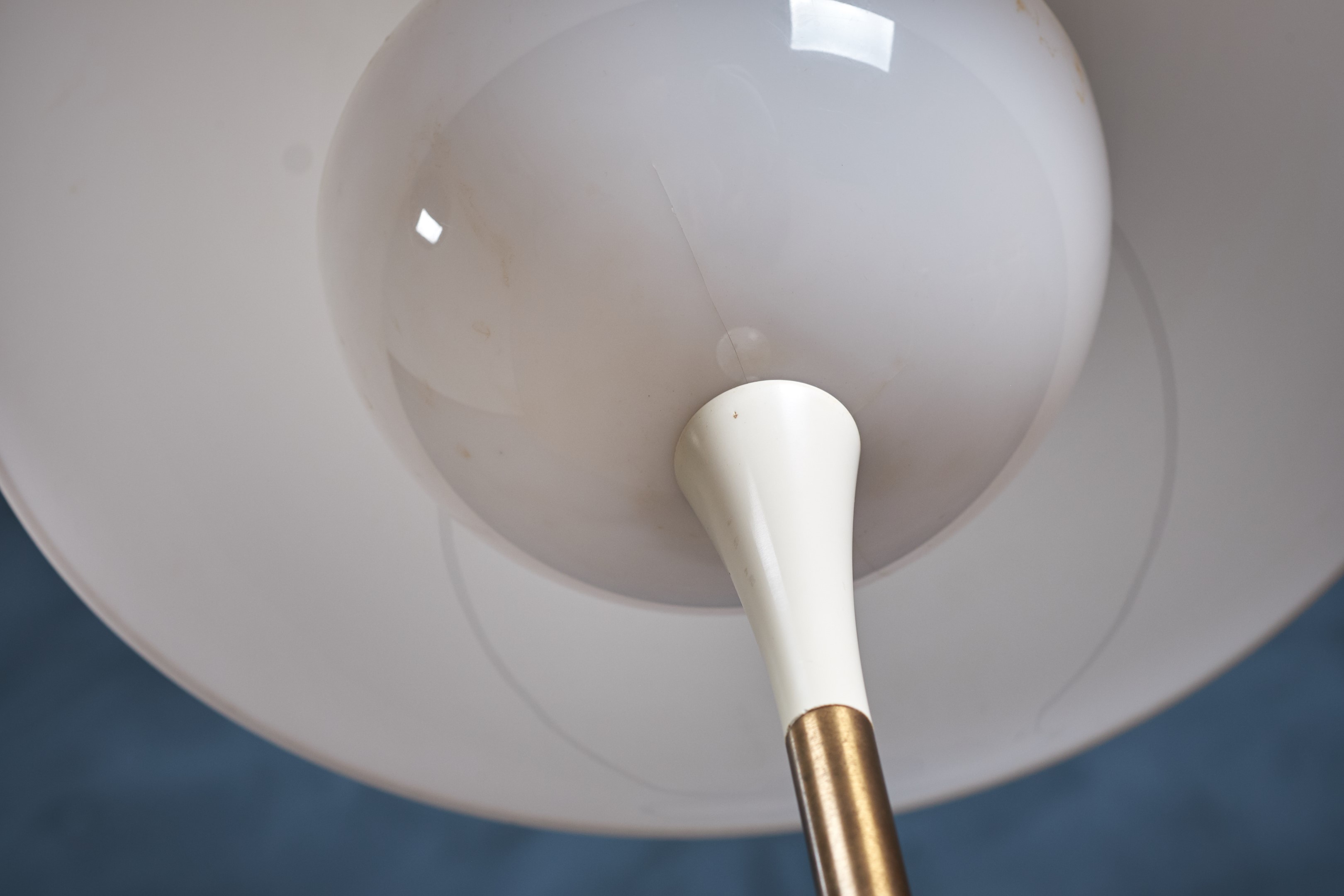 Floor lamp of brass and white-lacquered metal and plastic shade by LYFA (Denmark) 1960s. Small signs of wear and small screen with a little crack (nothing that bother your sight)