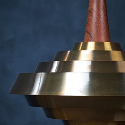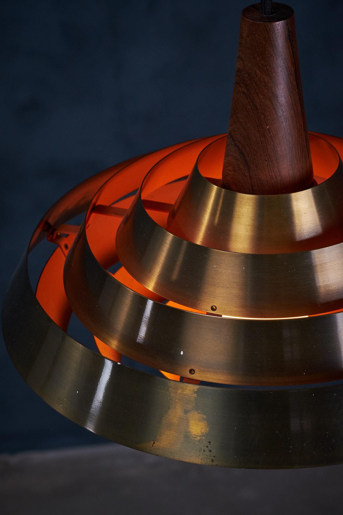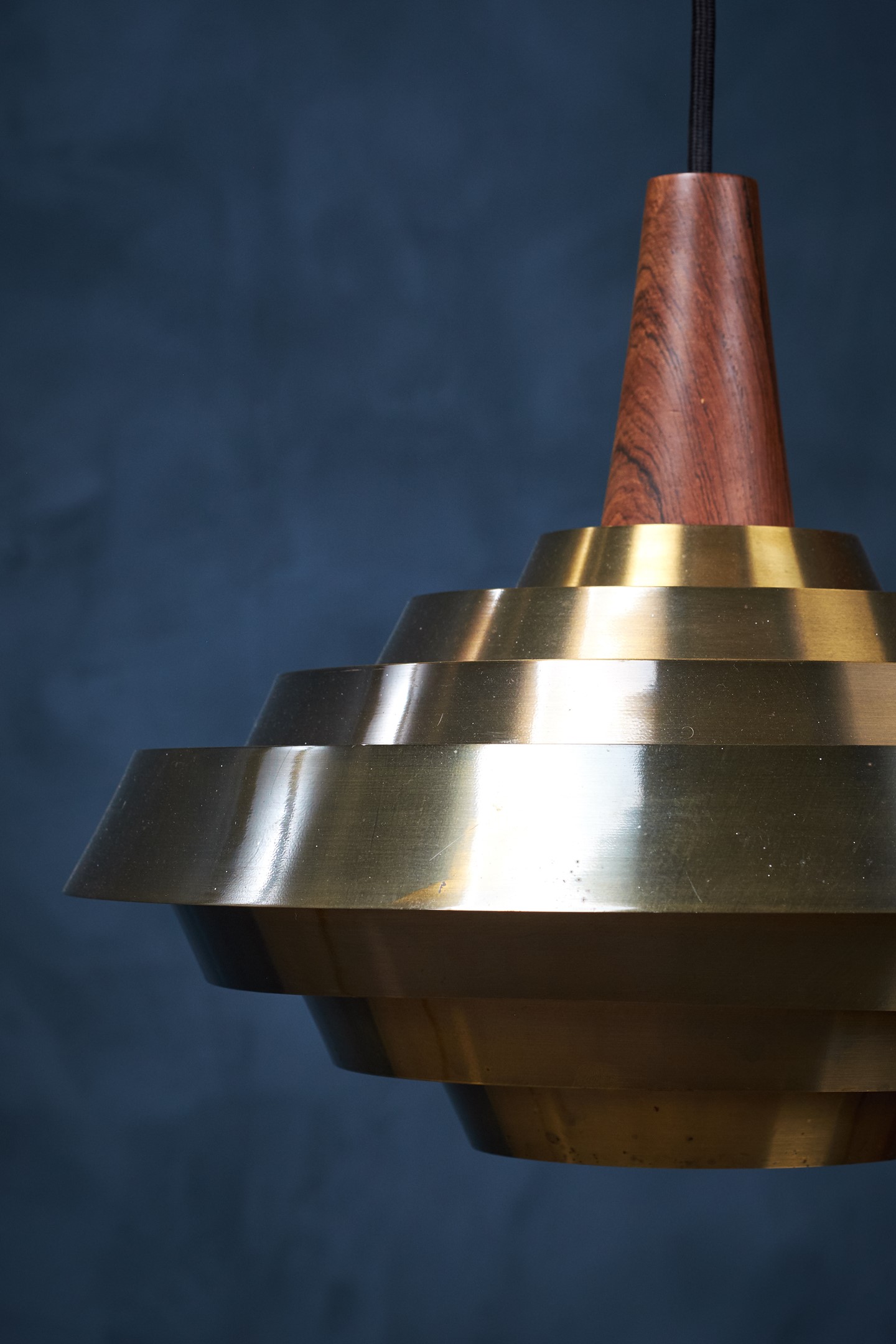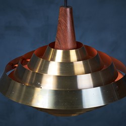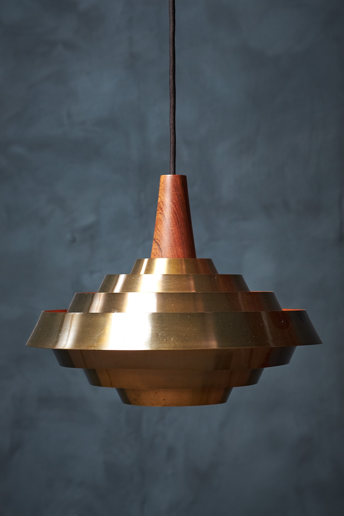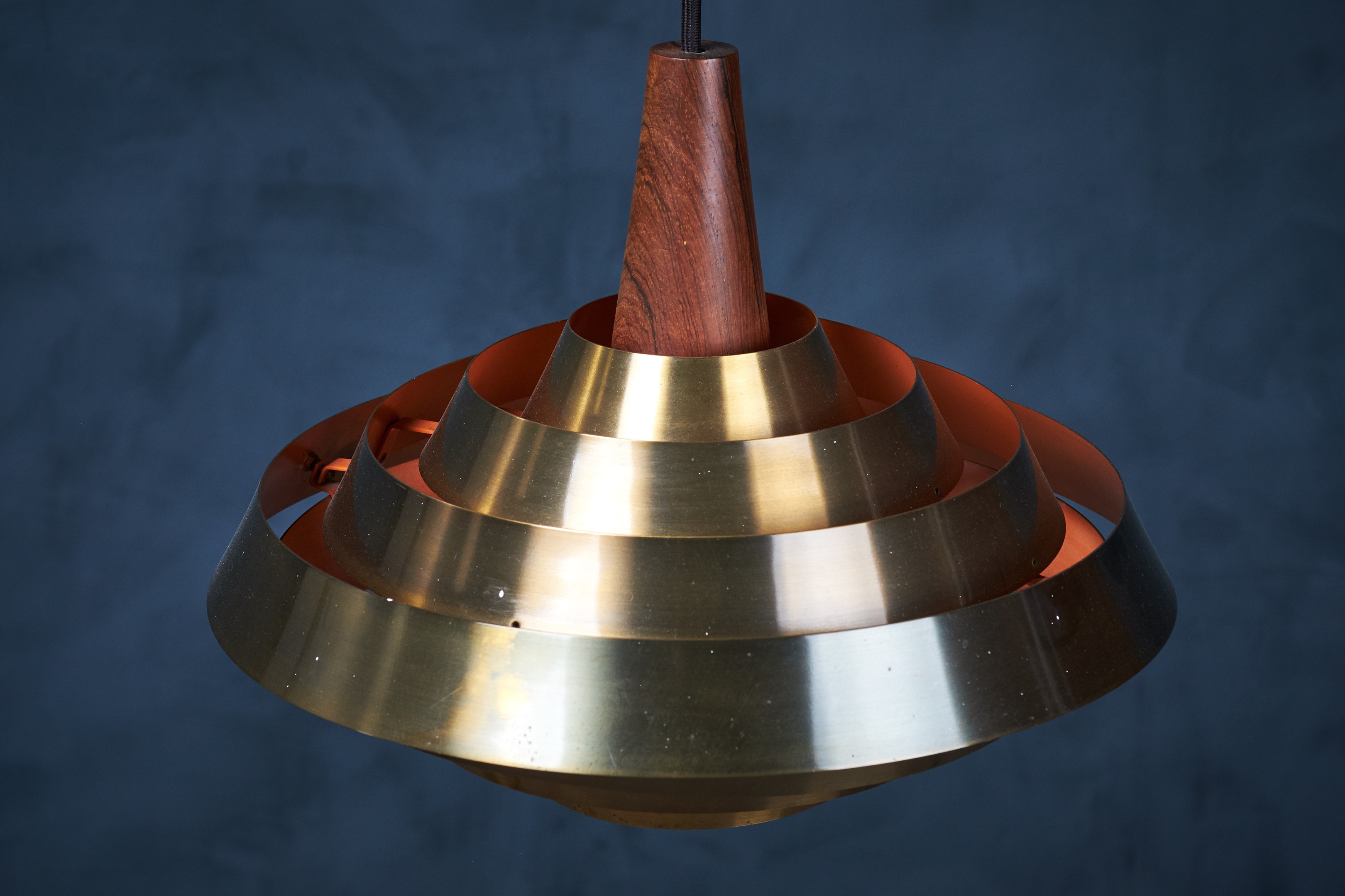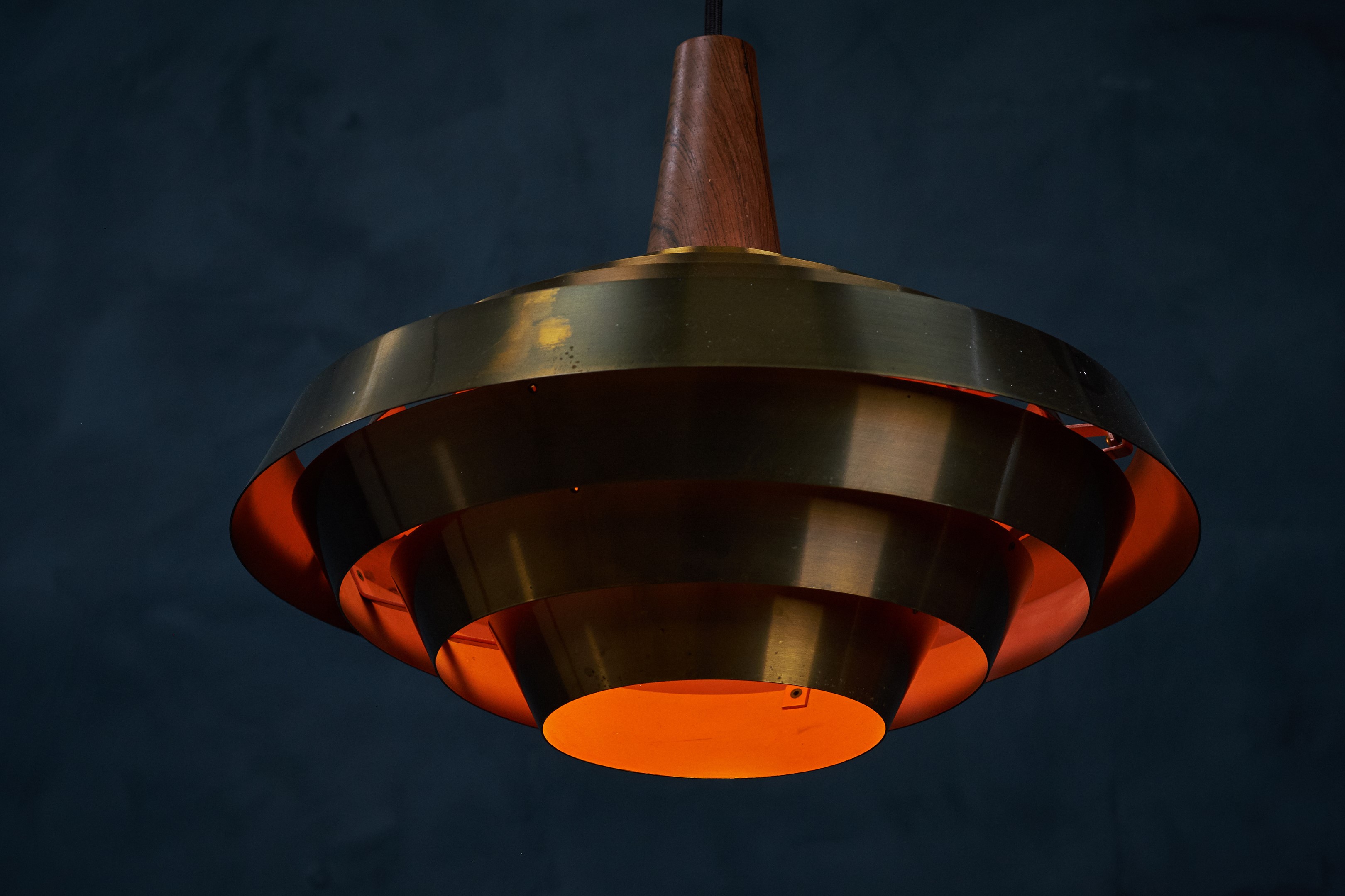 Stunning Danish pendant lamp in brass with solid teak top. The lamp is lacquered orange inside which perfectly works with the light and provides a warm and cozy light. This lamp is made in the 1960s Danish design era and that is easy to see. The lamp is in good vintage condition with no dents or big scratches. The lamp will come with a brand new white or black, fabric or plastic cord as you wish.