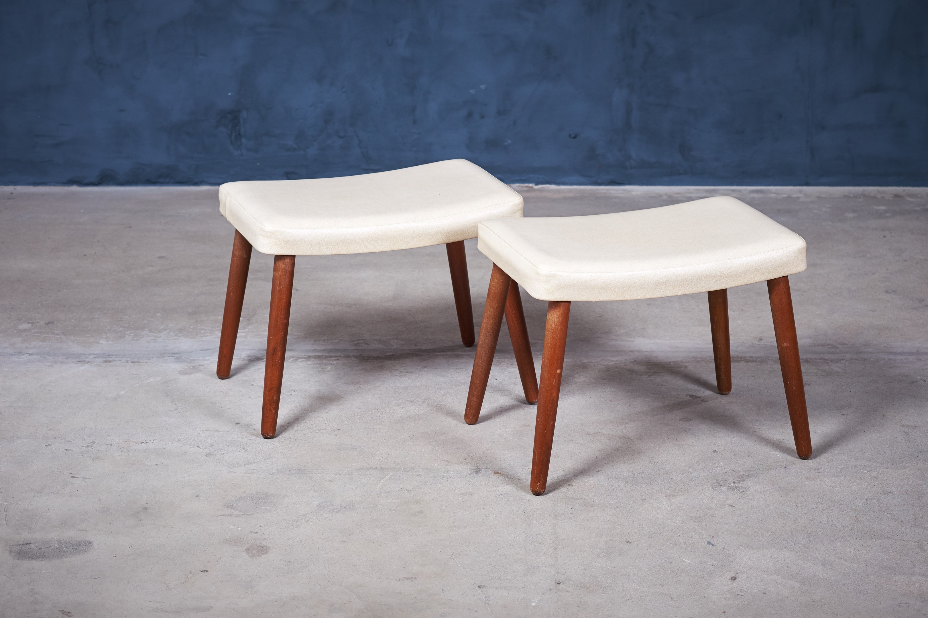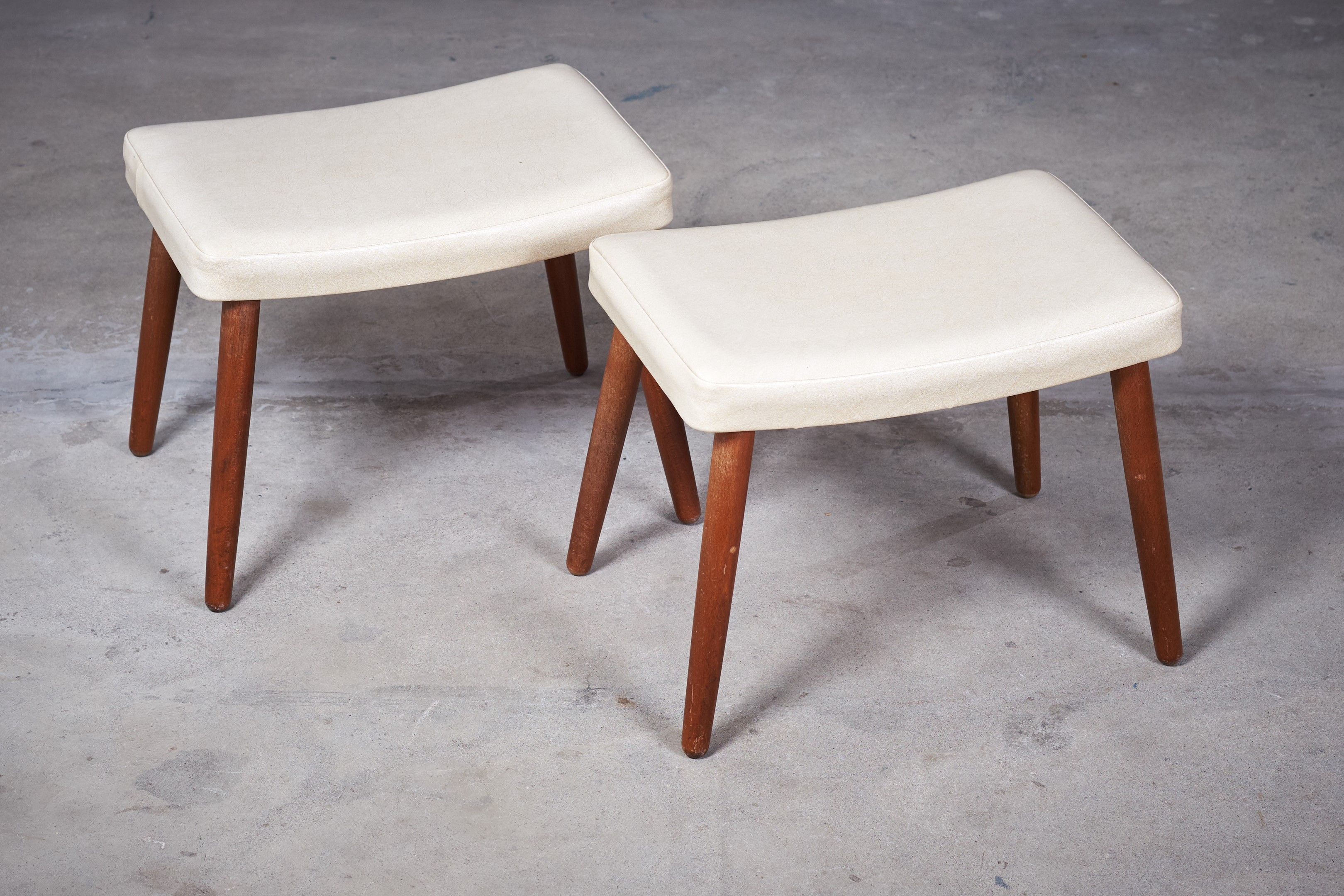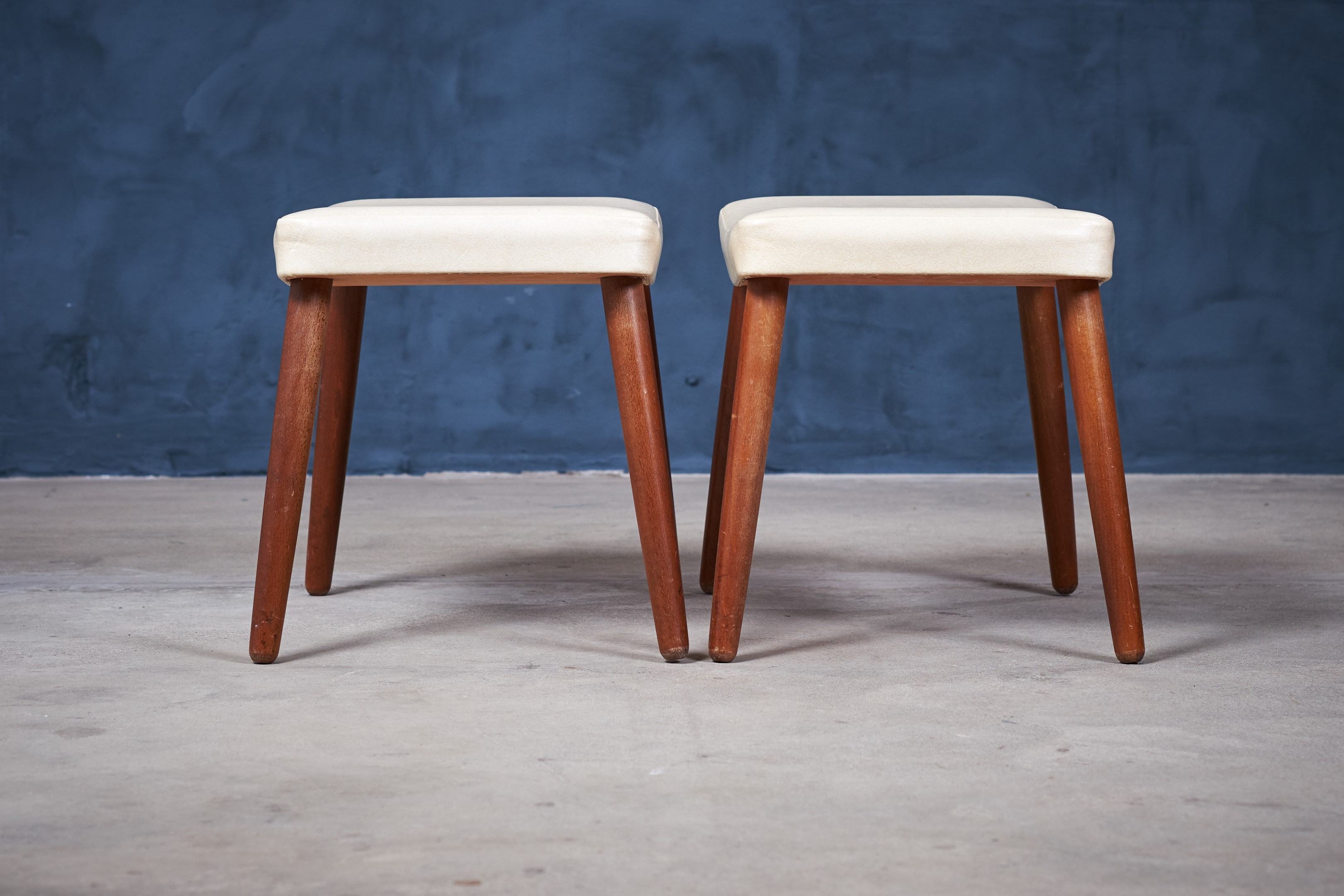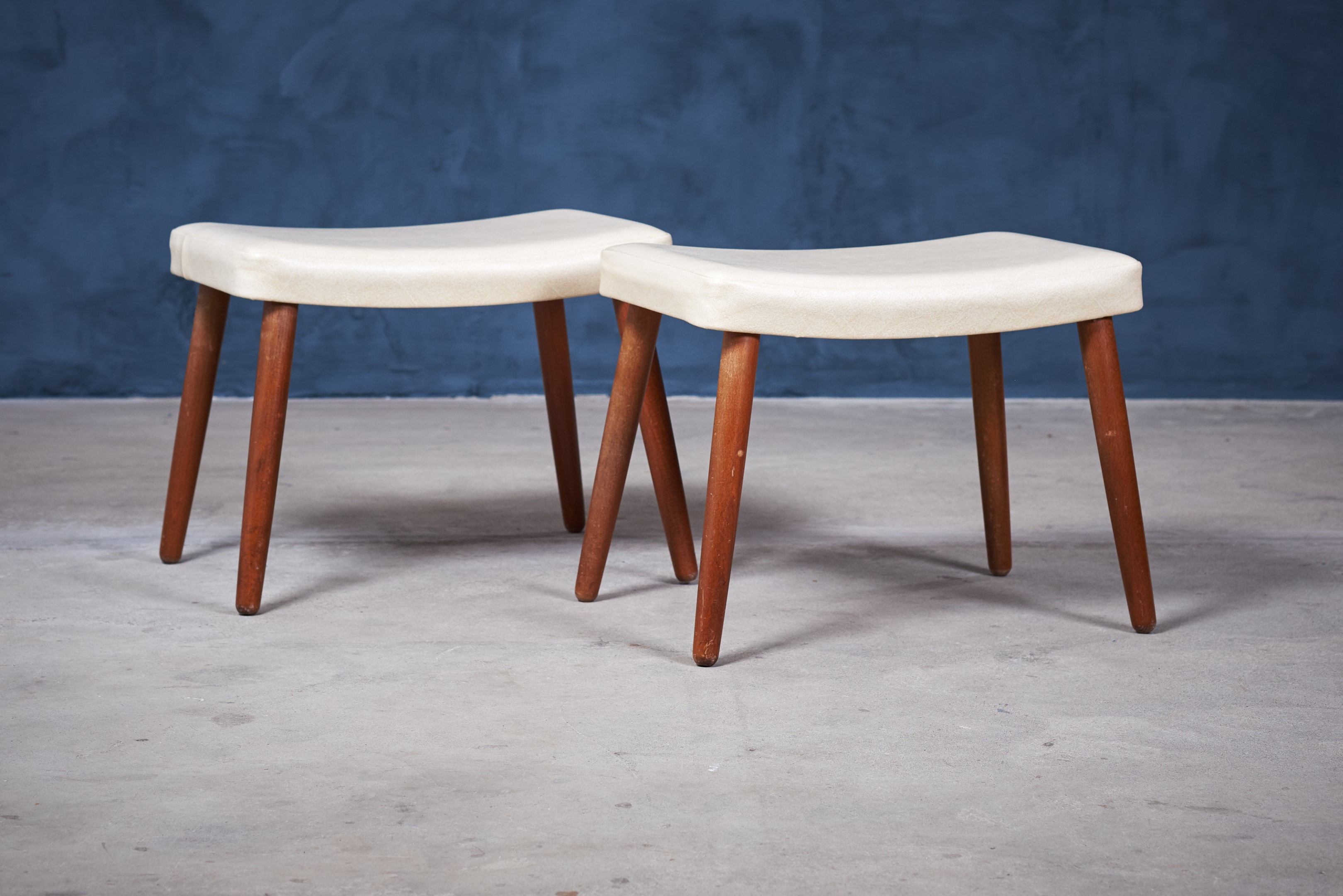 Set of 2 stools with inclined legs in solid teak and cover in artificial leather. Made in Denmark around the 60s and have been in the same home since. The stools are in good vintage condition and would be a great addition to any modern environment.