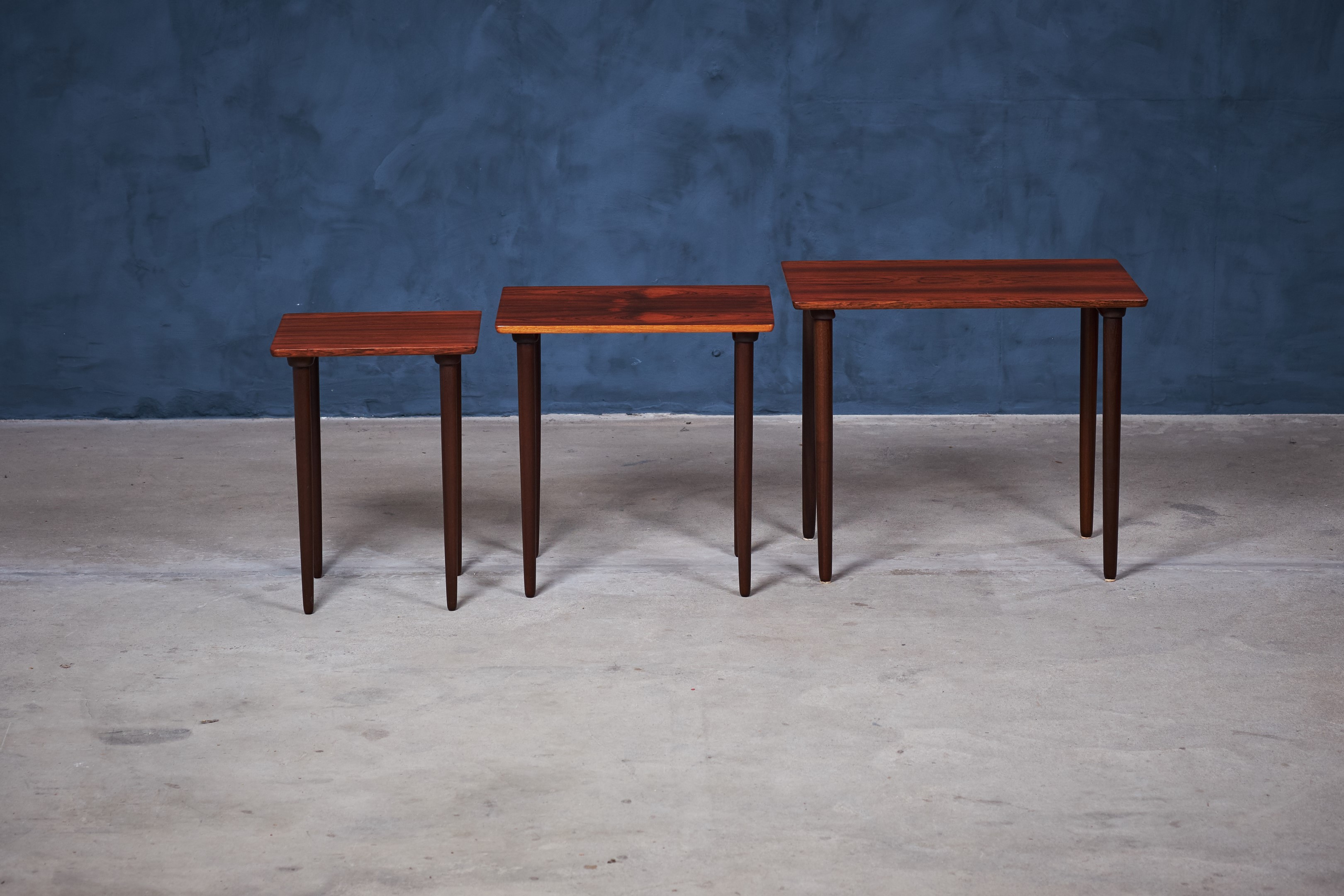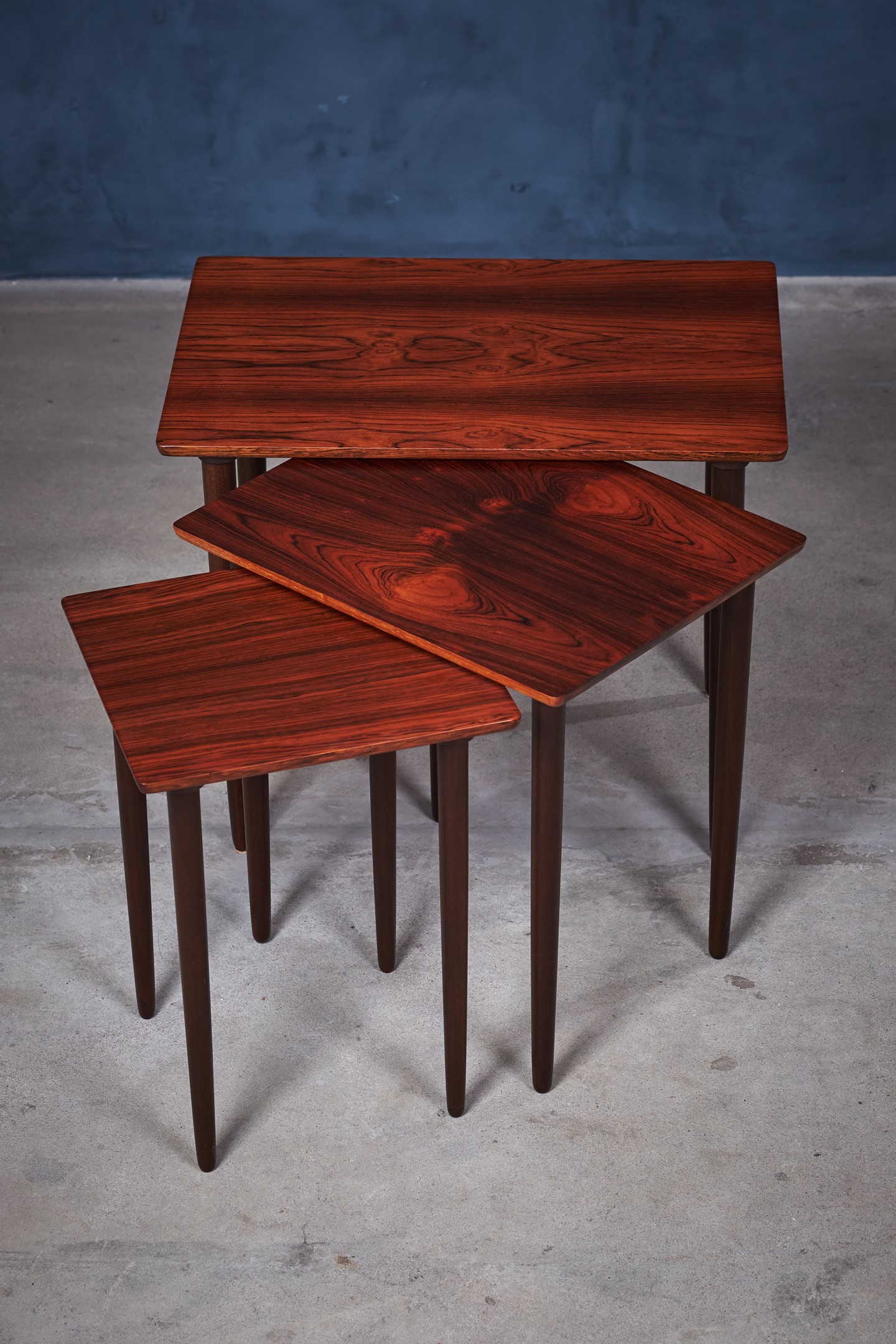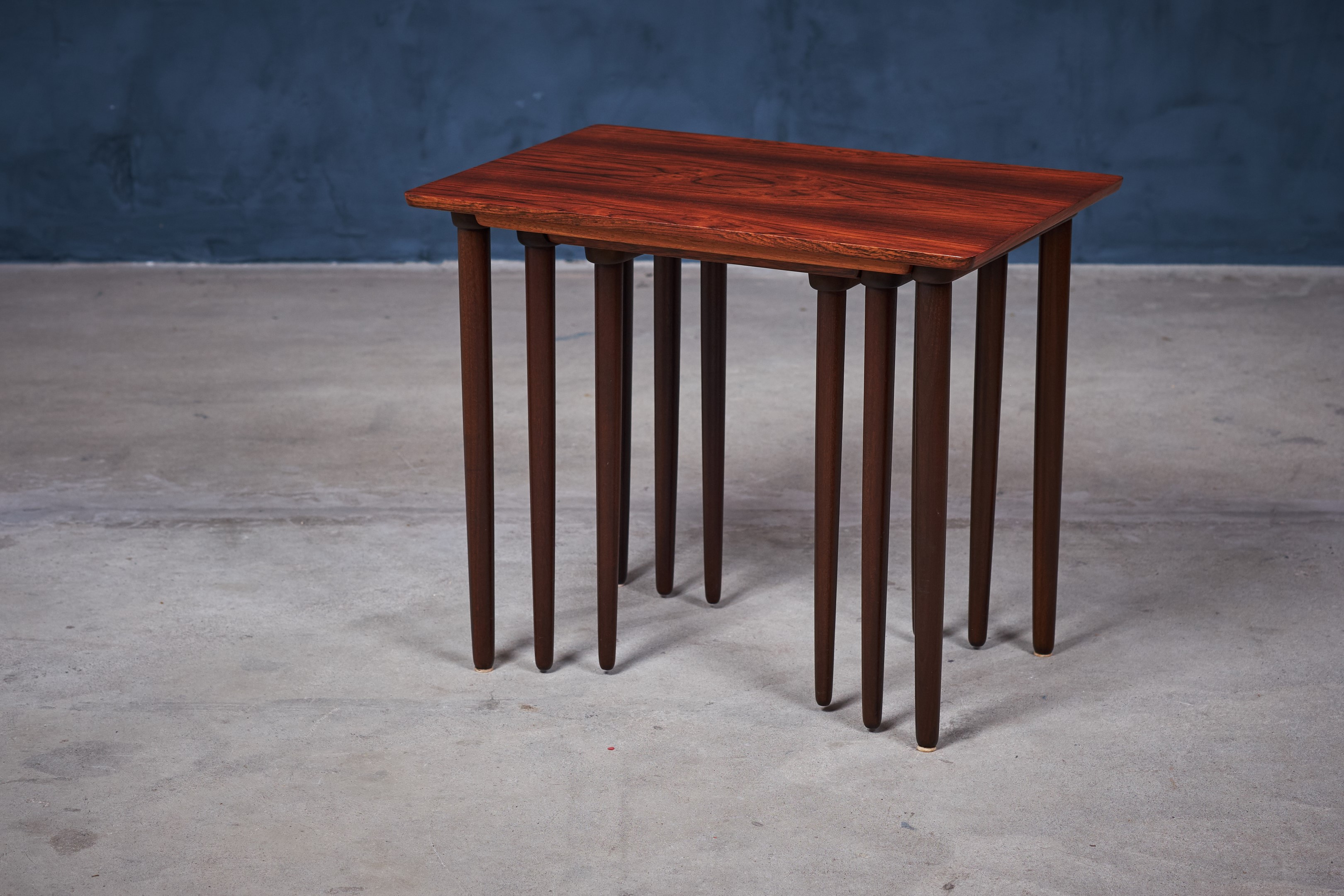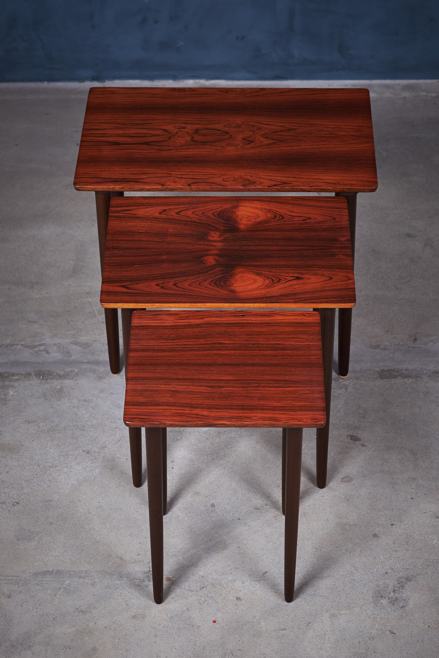 Set of three mid-century nesting tables by H.W. Klein. Features long tapered legs and an elegant rosewood grain throughout. Sleek design allows each table to slide comfortably underneath each other for convenient storage. The set has been sanded, oiled and polished, so its in perfect condition. This wonderful set makes the perfect addition to any modern interior. Labeled, "Made in Denmark by Bramin.