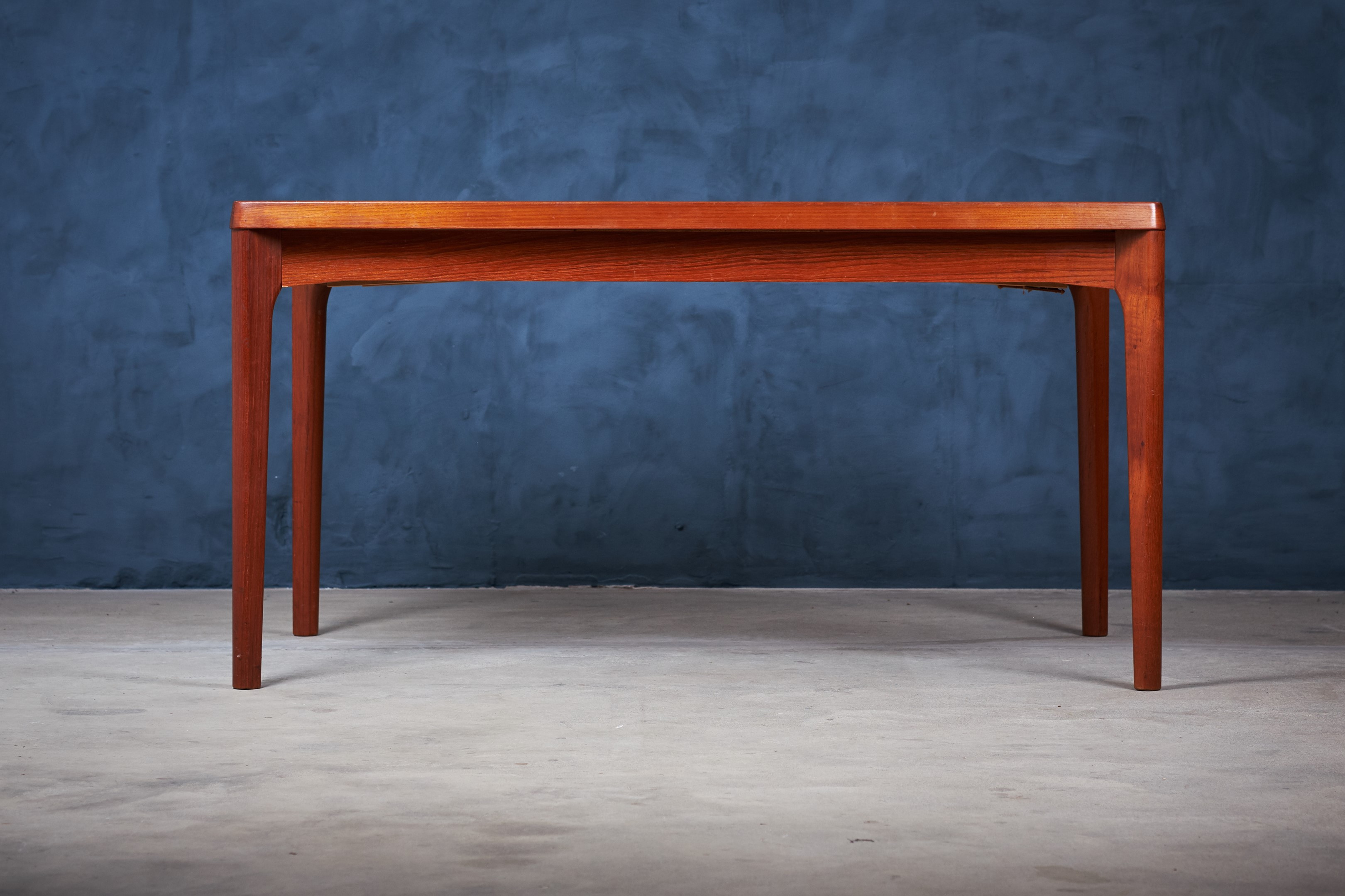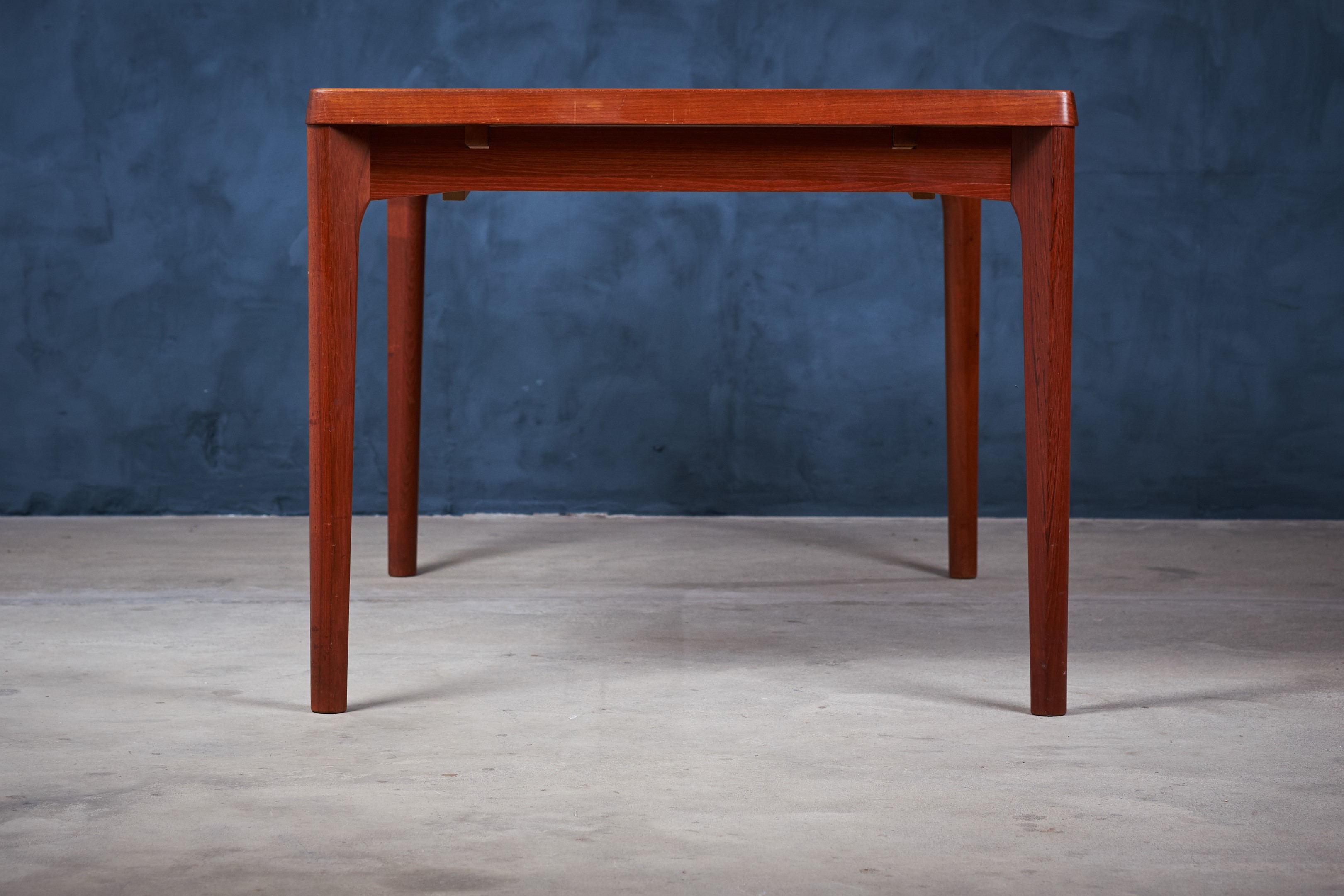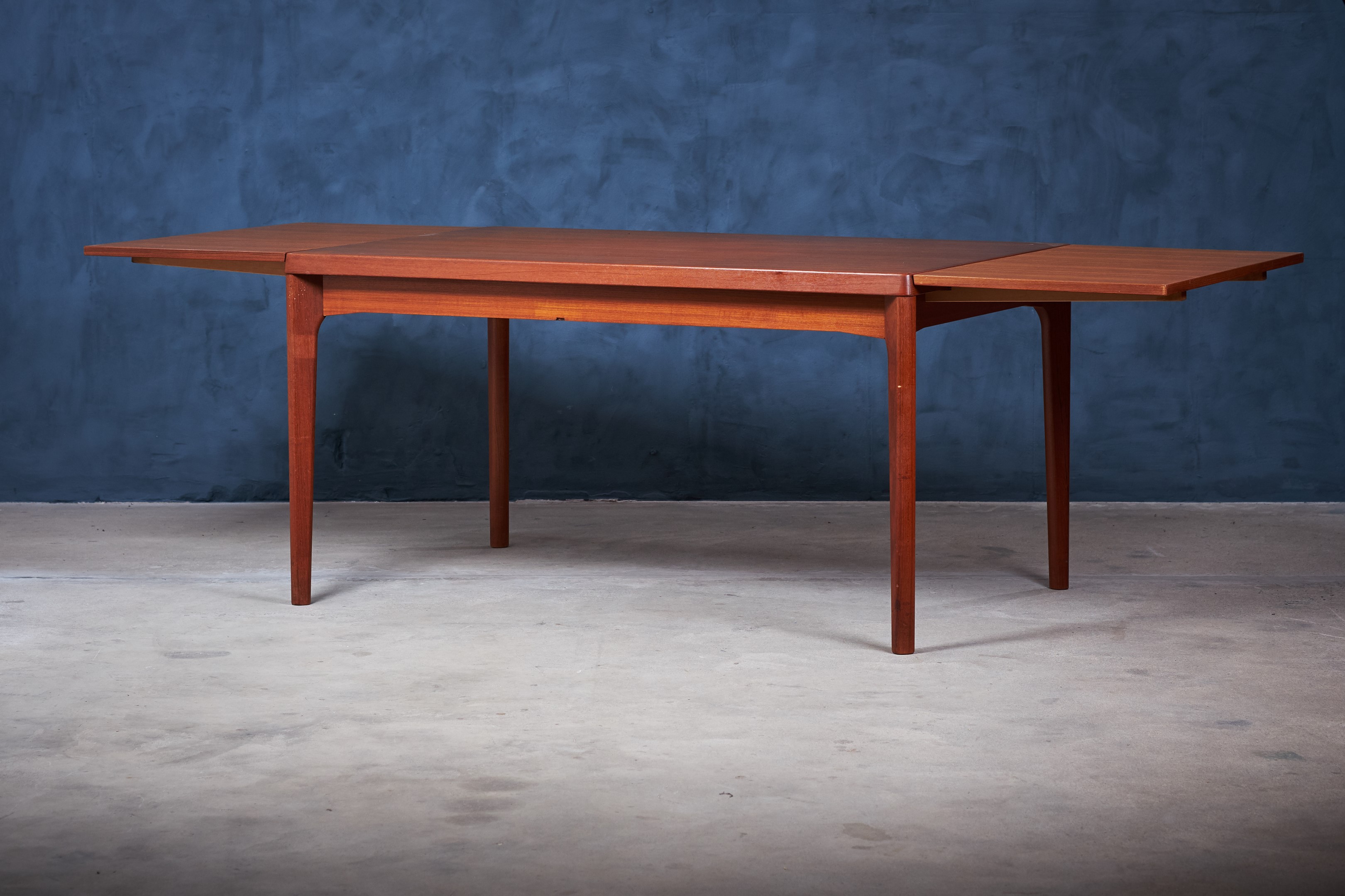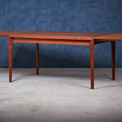 Henning Kjærnulf teak dining table with dutch leaves. The table can be up to 230cm wide when fully extended. A beautiful detailed dining table with draw leaves hidden under the table top. The table are in good vintage condition and will be shined and polished before shipping by our professionel carpenter. The table is stamped by maker: Vejle Stole & Møbelfabrik.
