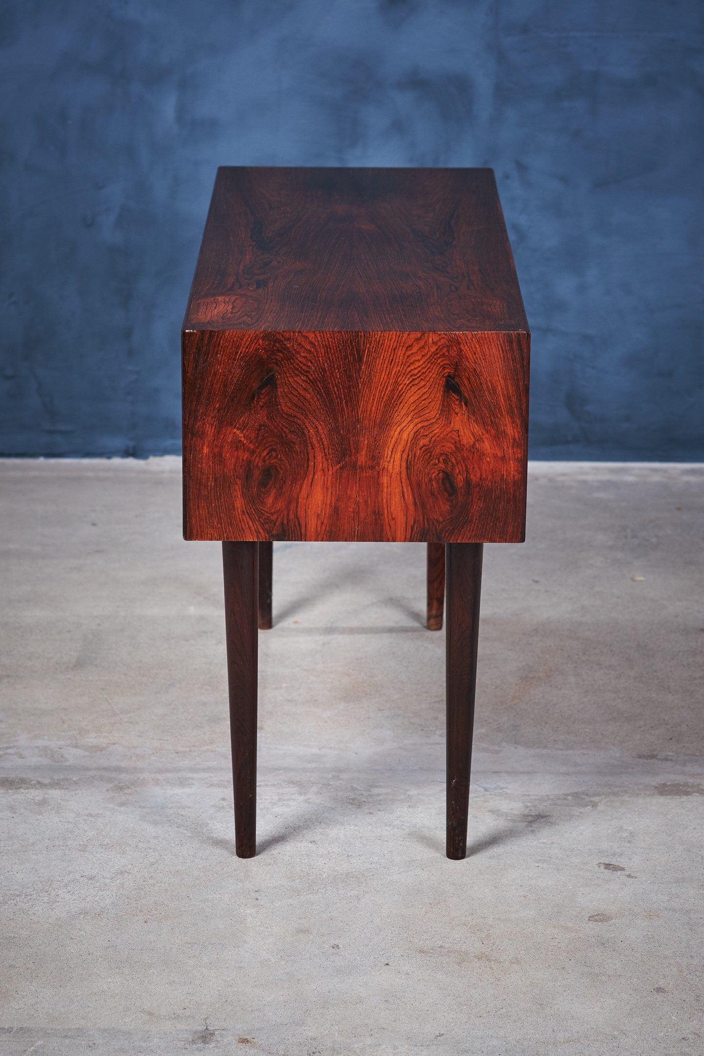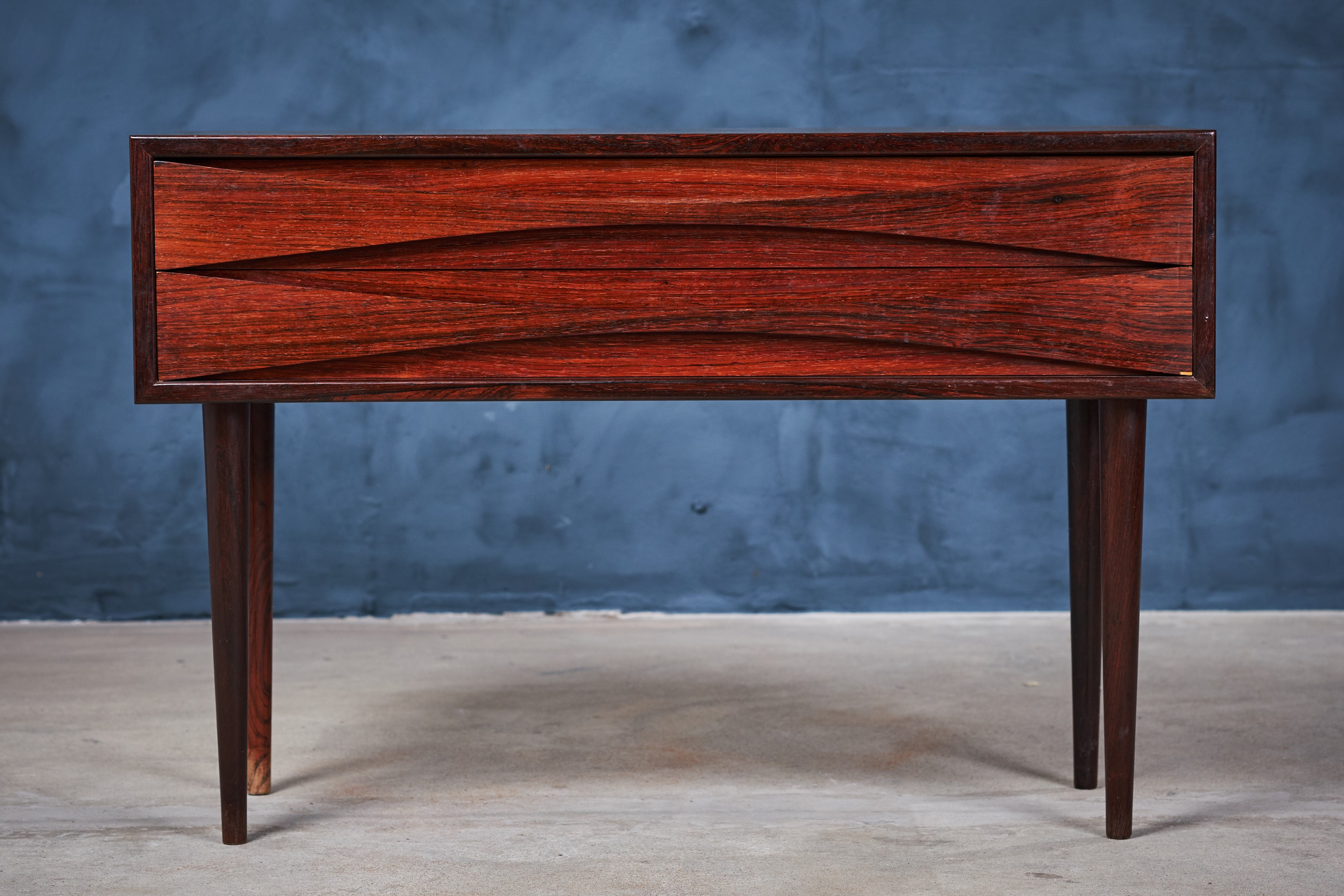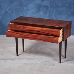 An elegant long, two-drawer cabinet from Arne Vodder in rosewood veneer. The cabinet is in really good condition. It comes with his signature handles and solid tapered legs. It is produced for NC Møbler in Odense, Denmark.
