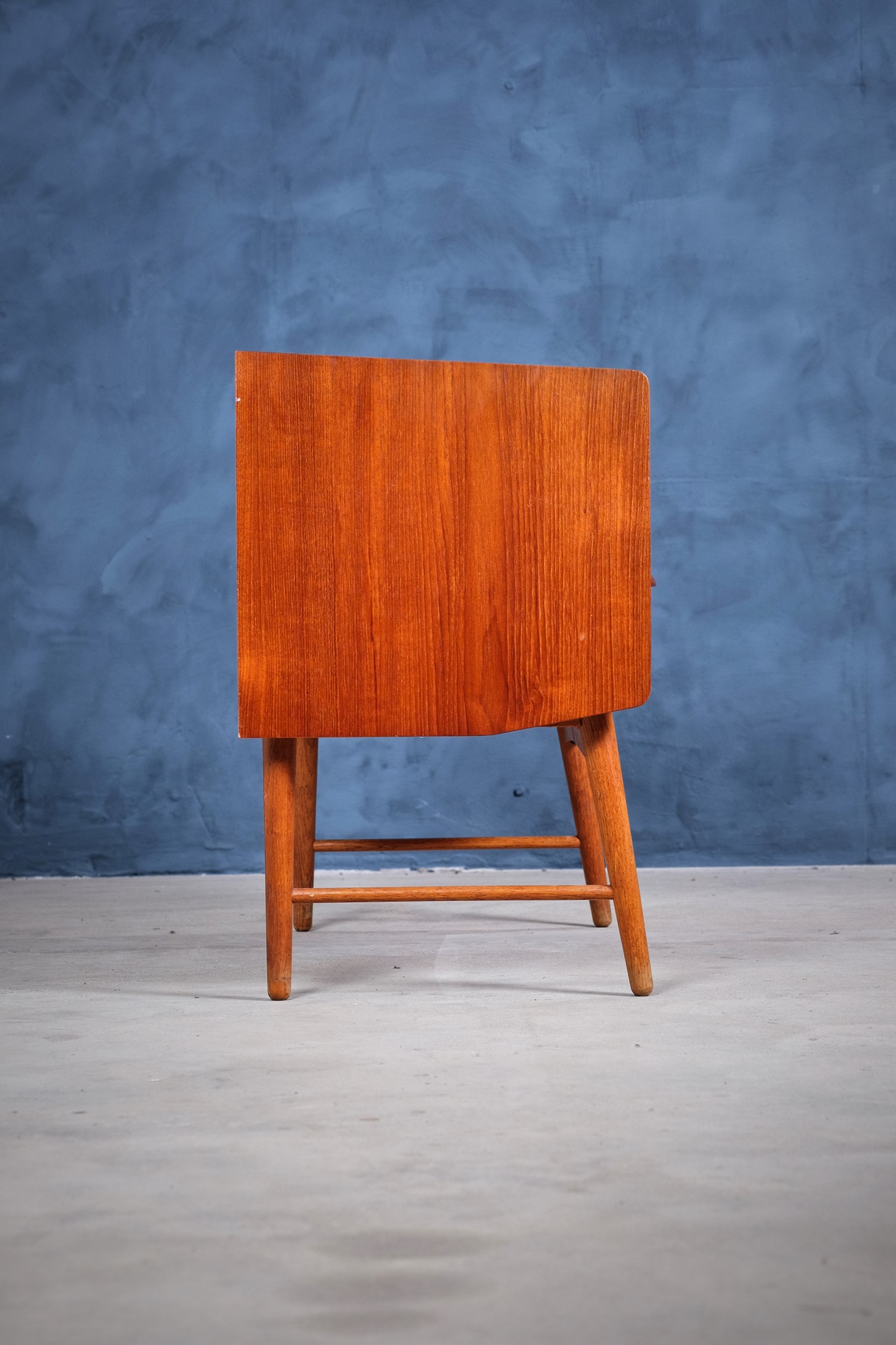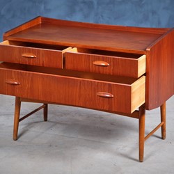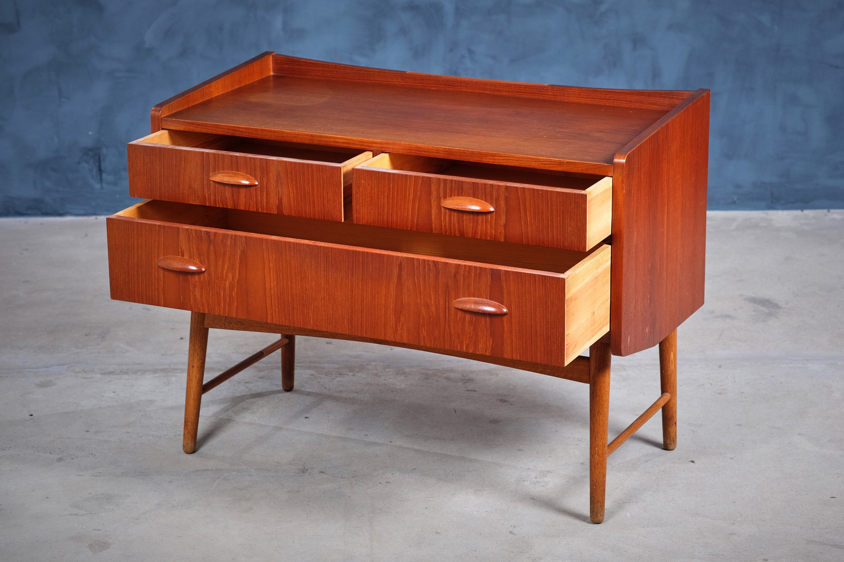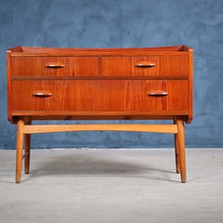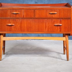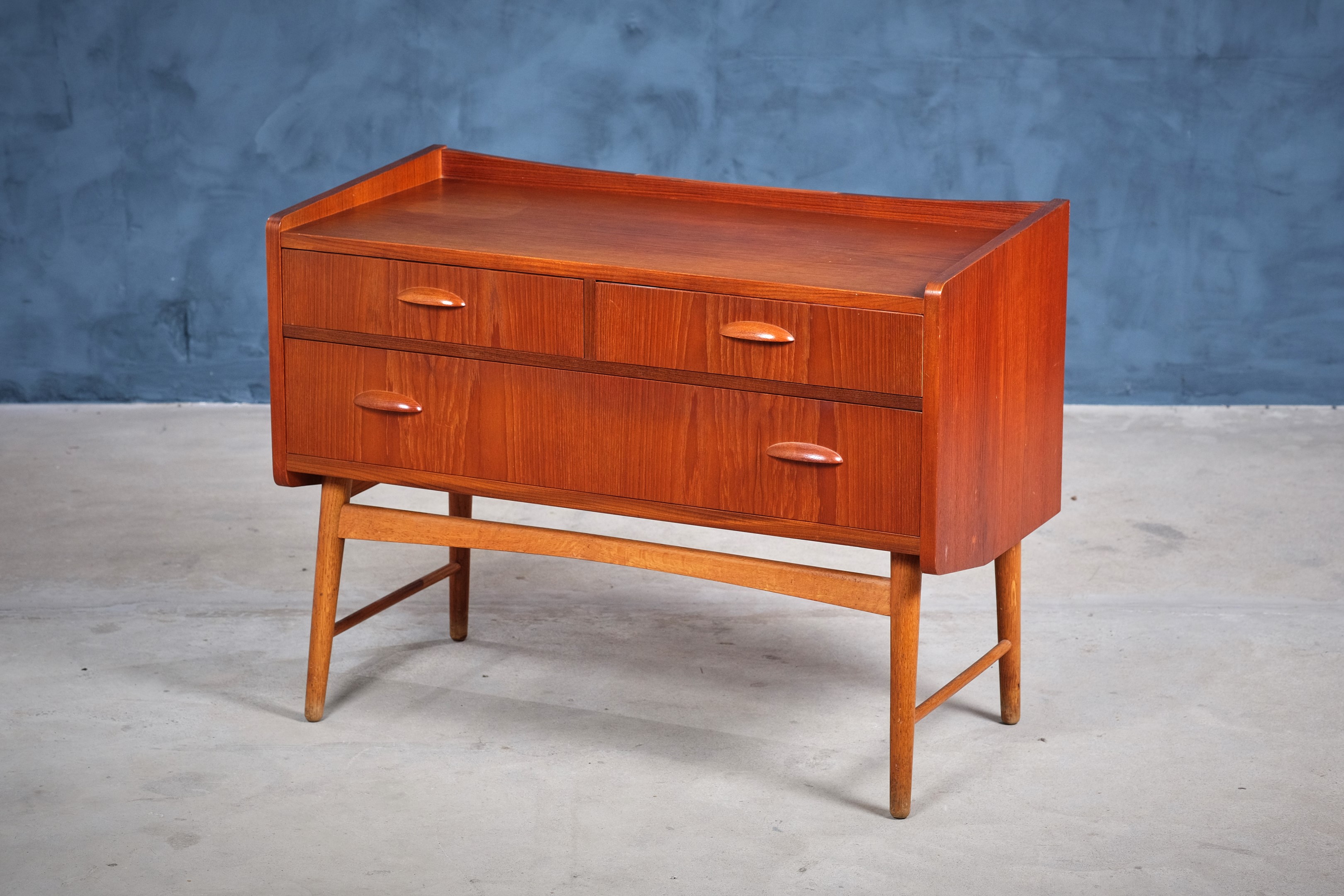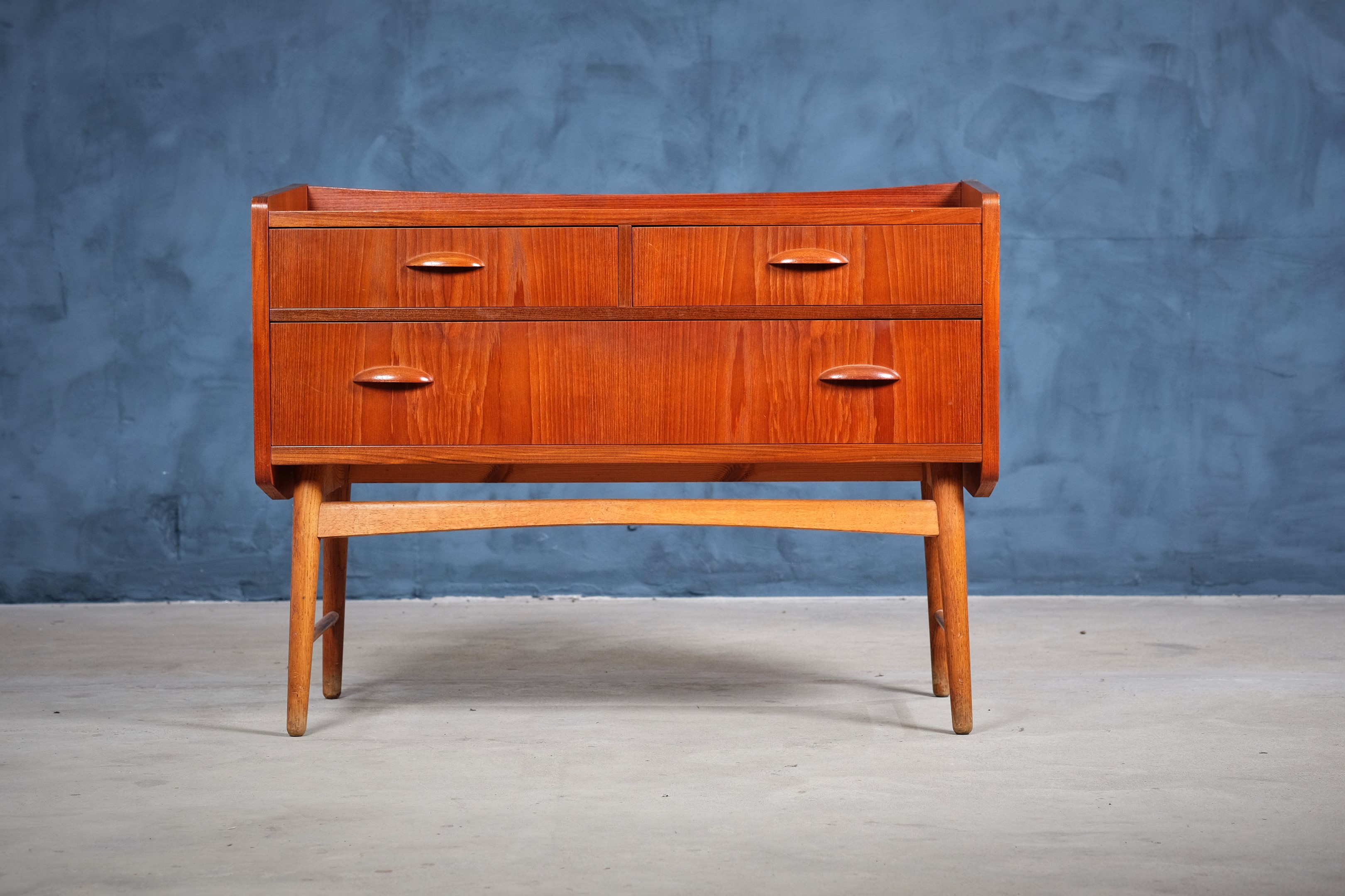 Chest of drawers in teak with a beautiful and elegant frame made of solid oak. Features, two small and one big drawer with lots of storage room. This chest of drawers can be used in your entrance, bedroom, living room etc. At least it is not difficult to find room for this beauty. Would make an great addition to any modern environment.
