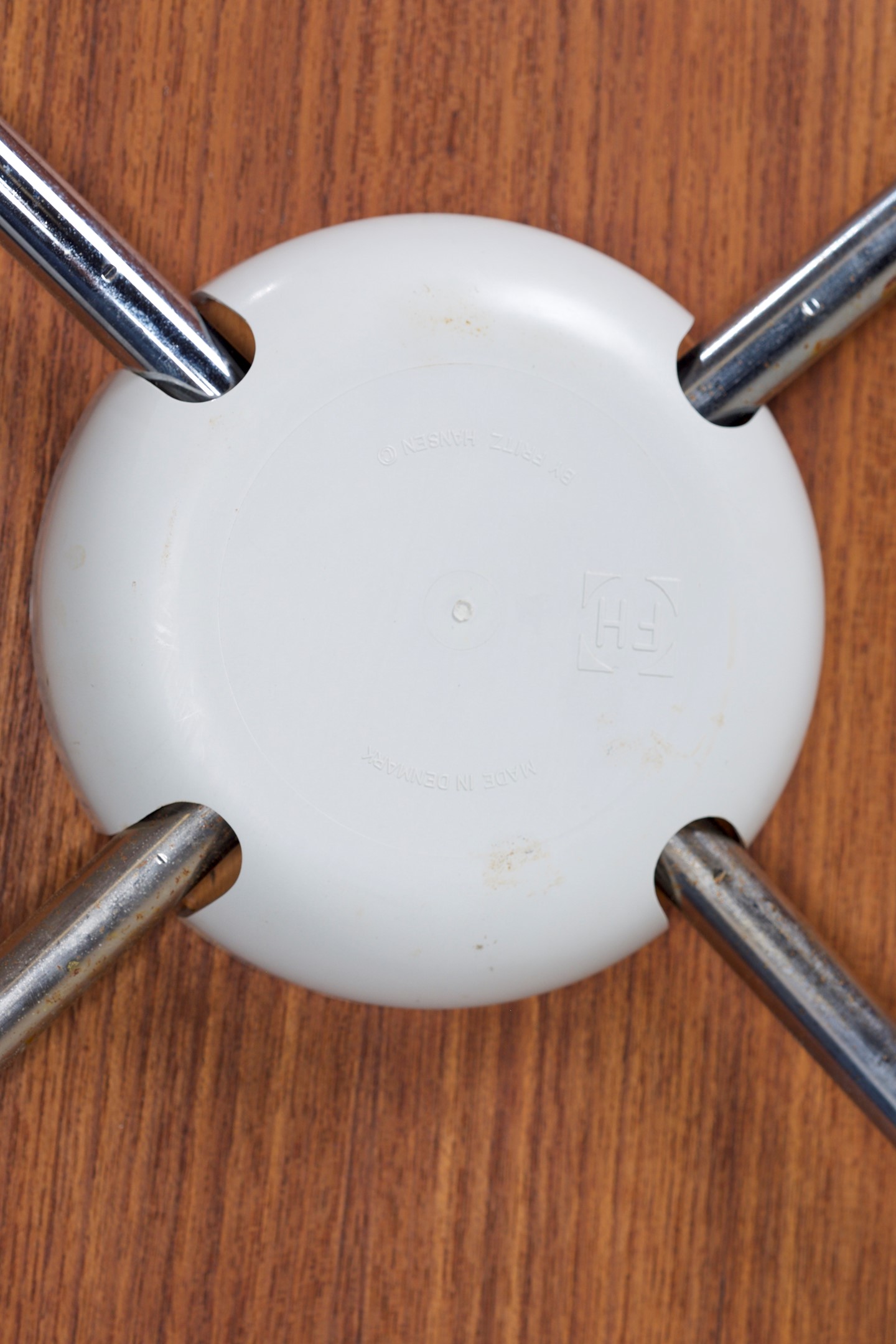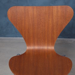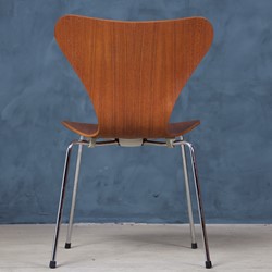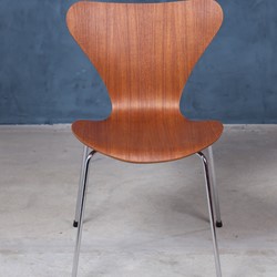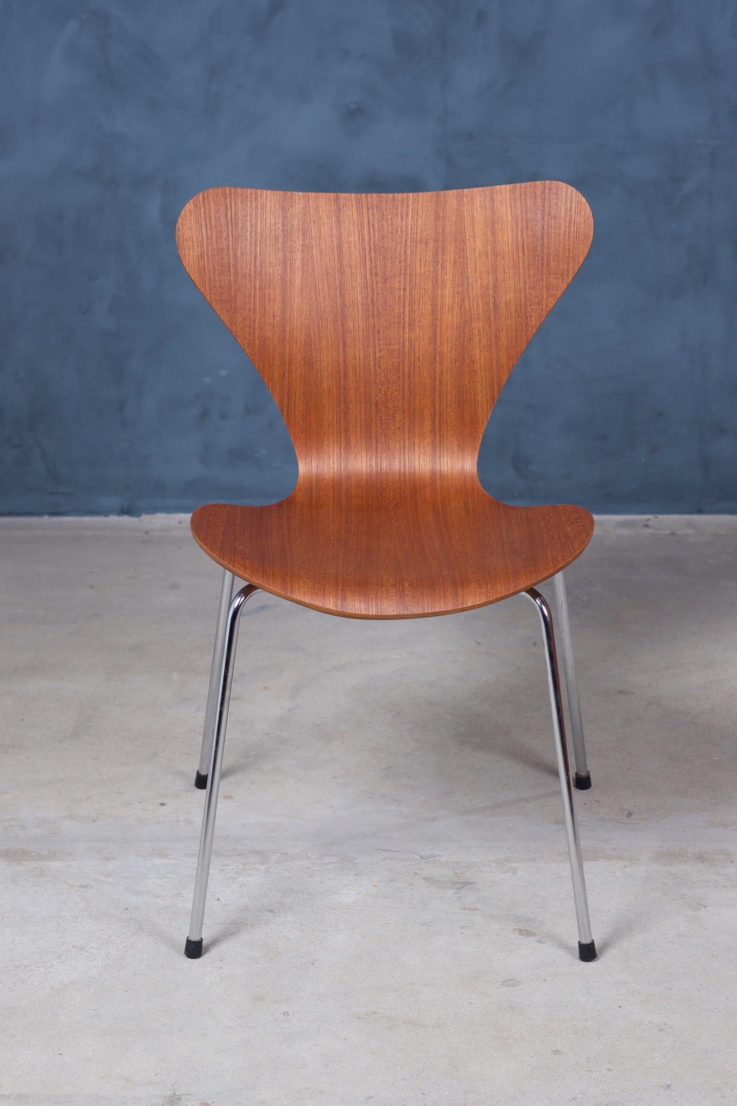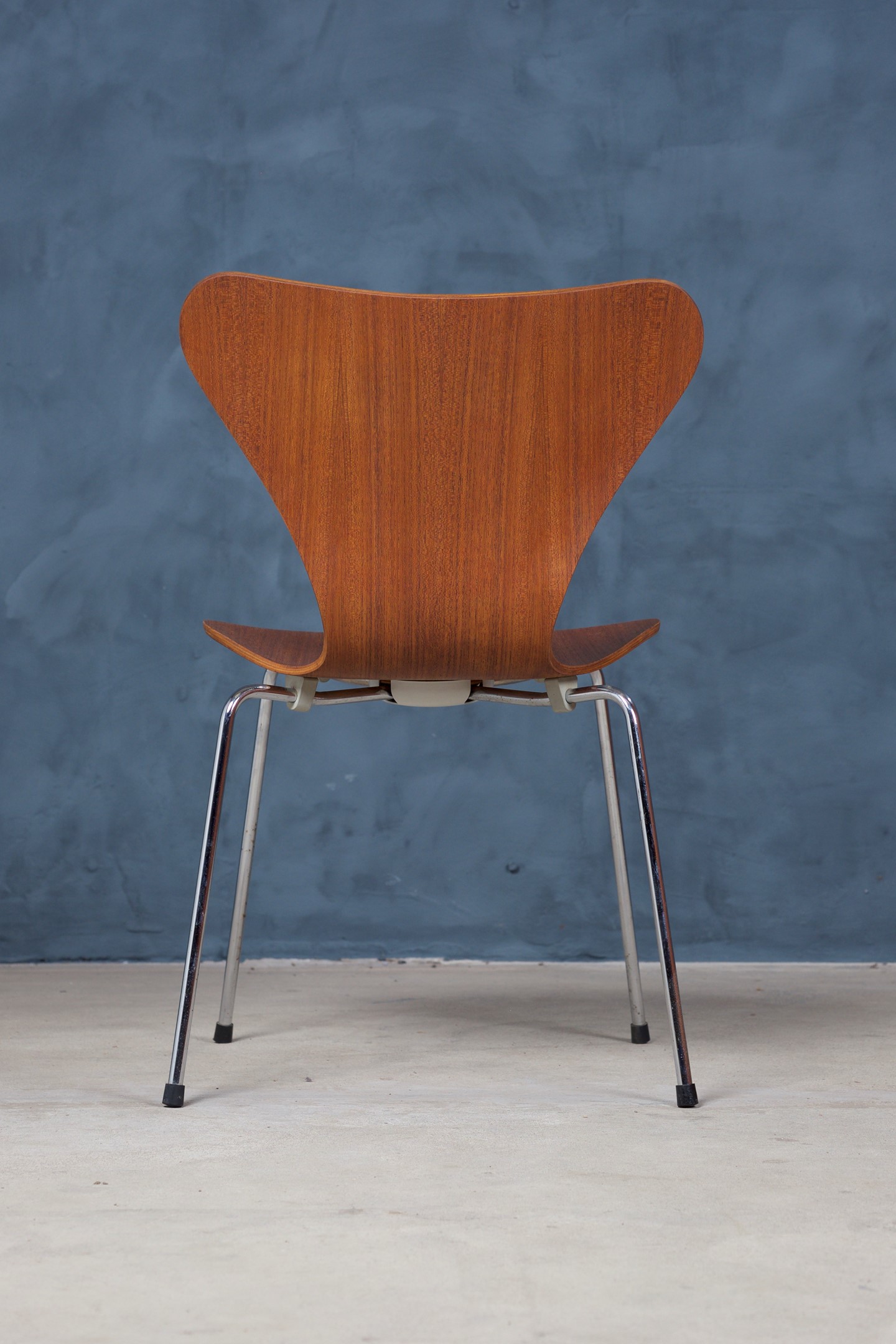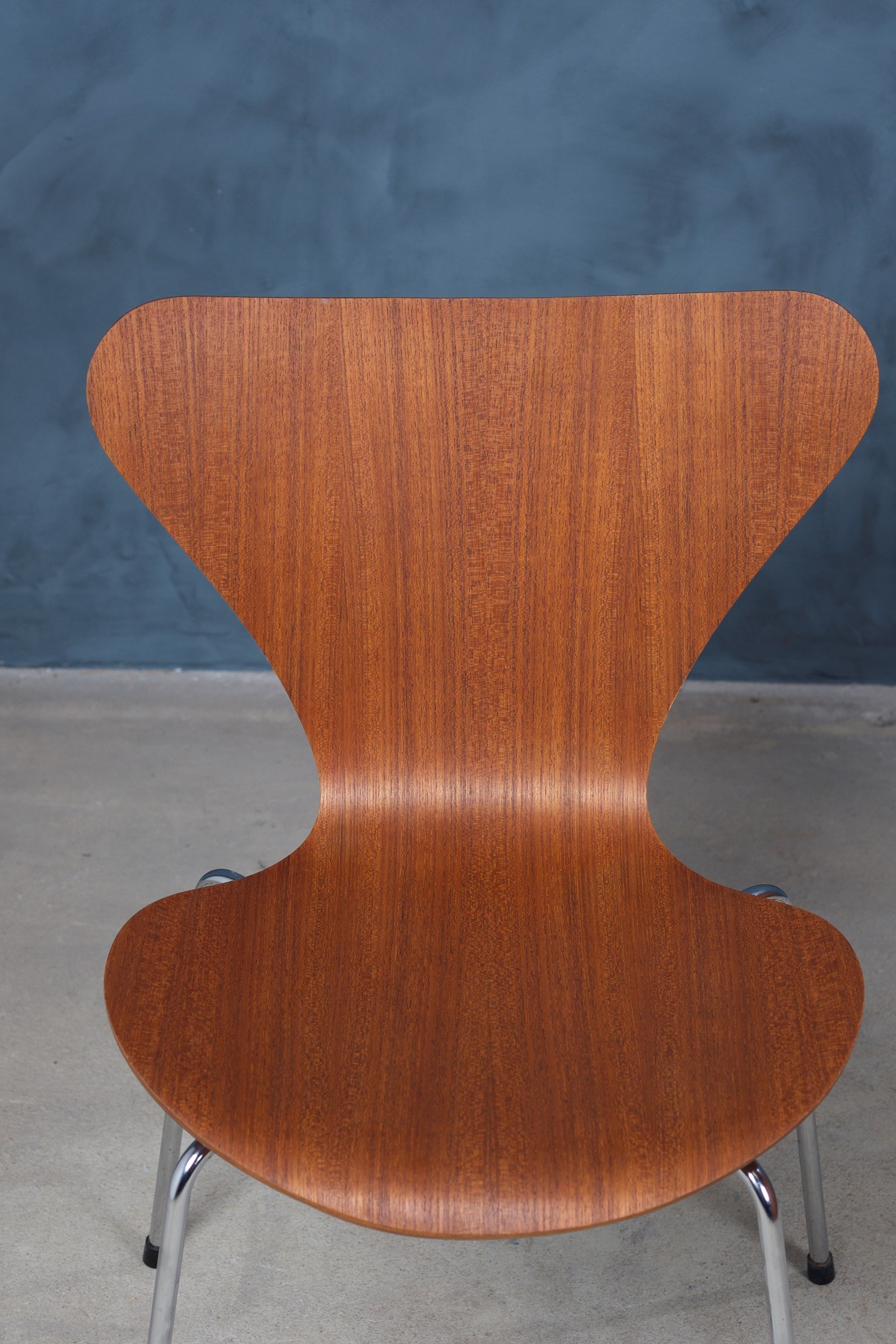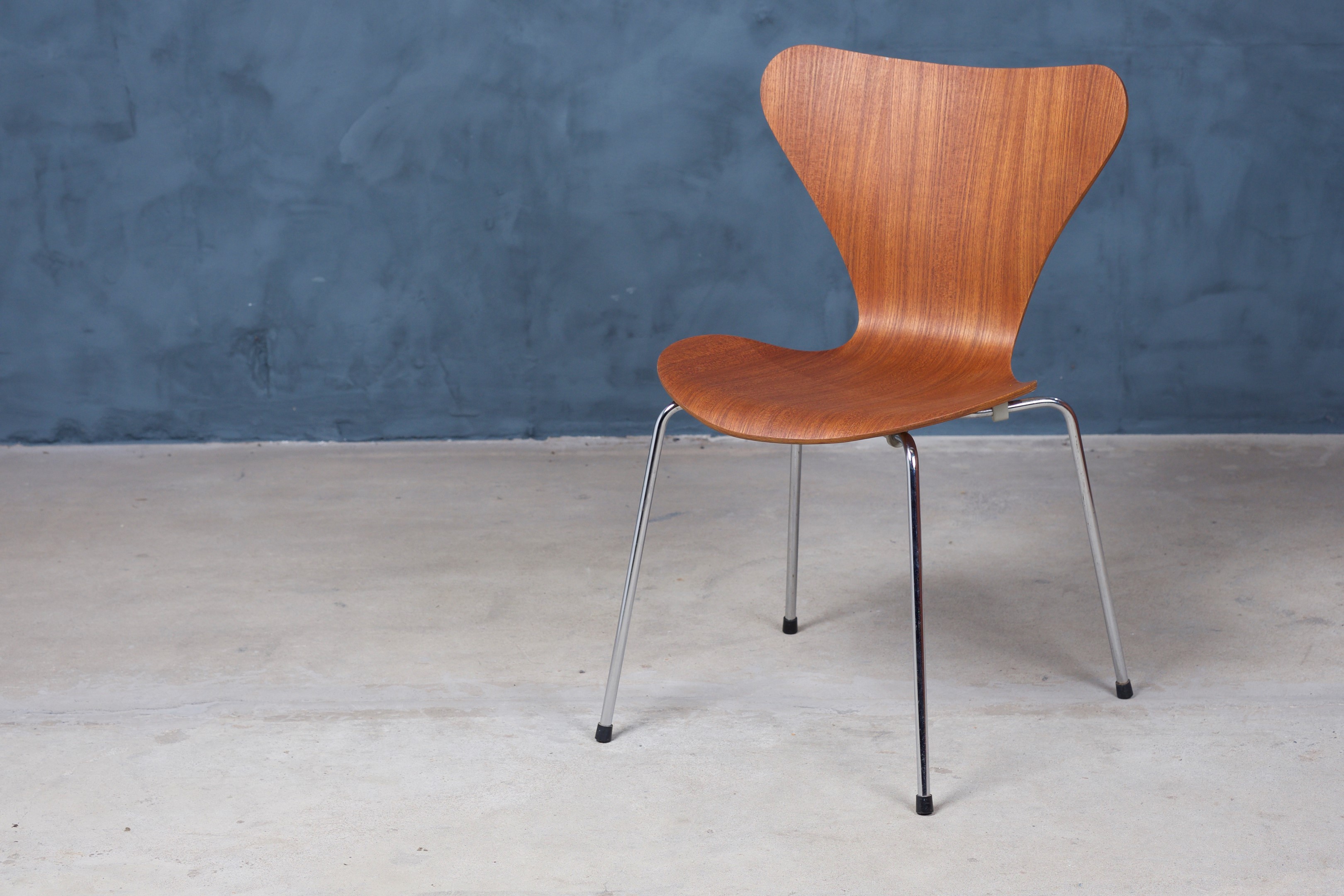 Iconic chair model 3107 from the 7 series designed by Arne Jacobsen and manufactured by Fritz Hansen, Denmark in the 1950s. This series was designed in 1955 and debuted in Sweden at the Helsingborg exhibition. It is comprised of teak plywood which is uniquely shaped for the human body. This chair is sometimes called the butterfly chair due to this unusual, comfortable shape. The chair has been refurbished by our carpenter and are in really good condition. This chair would make an great addition to any modern environment.