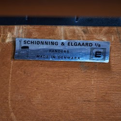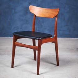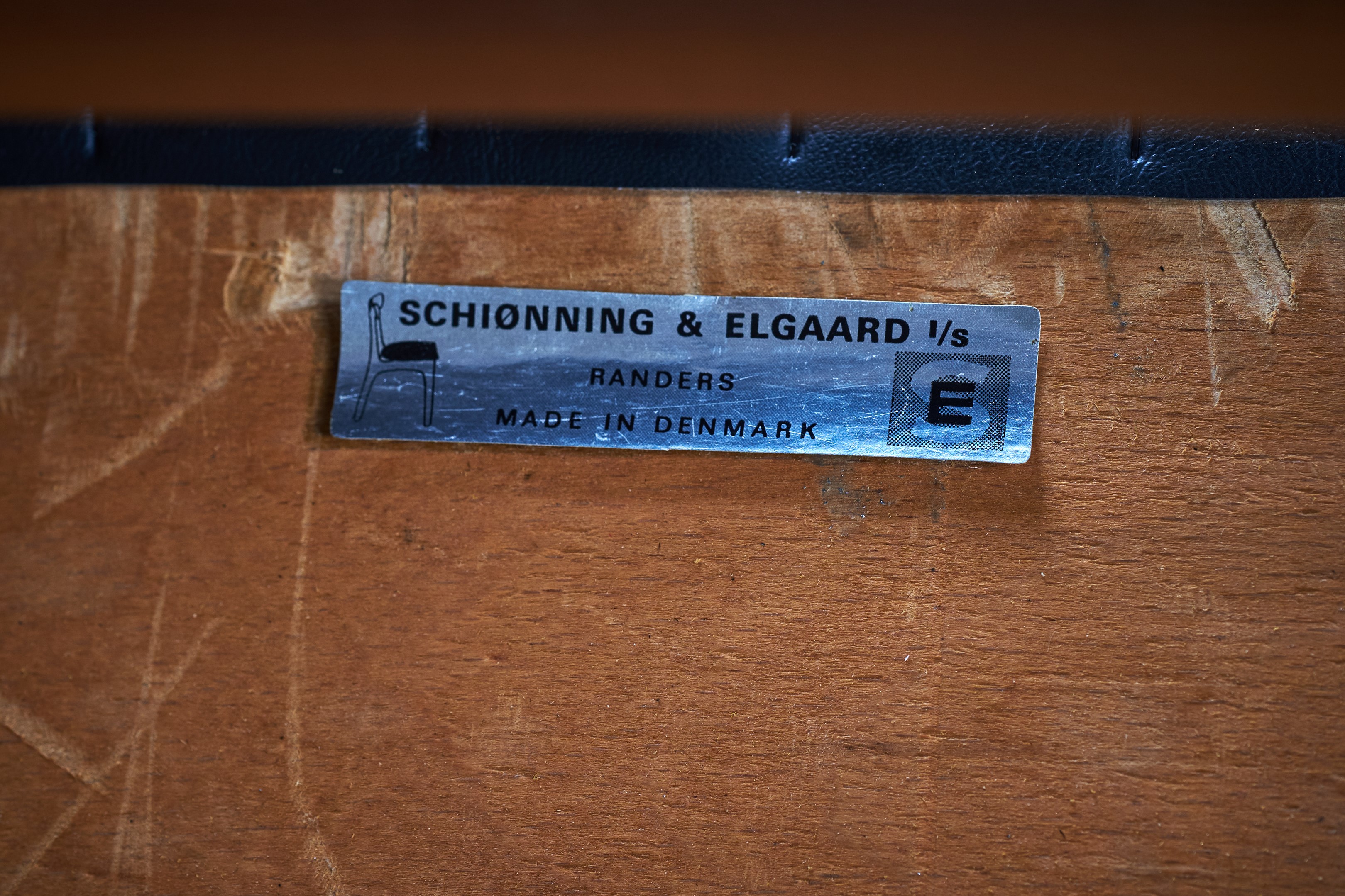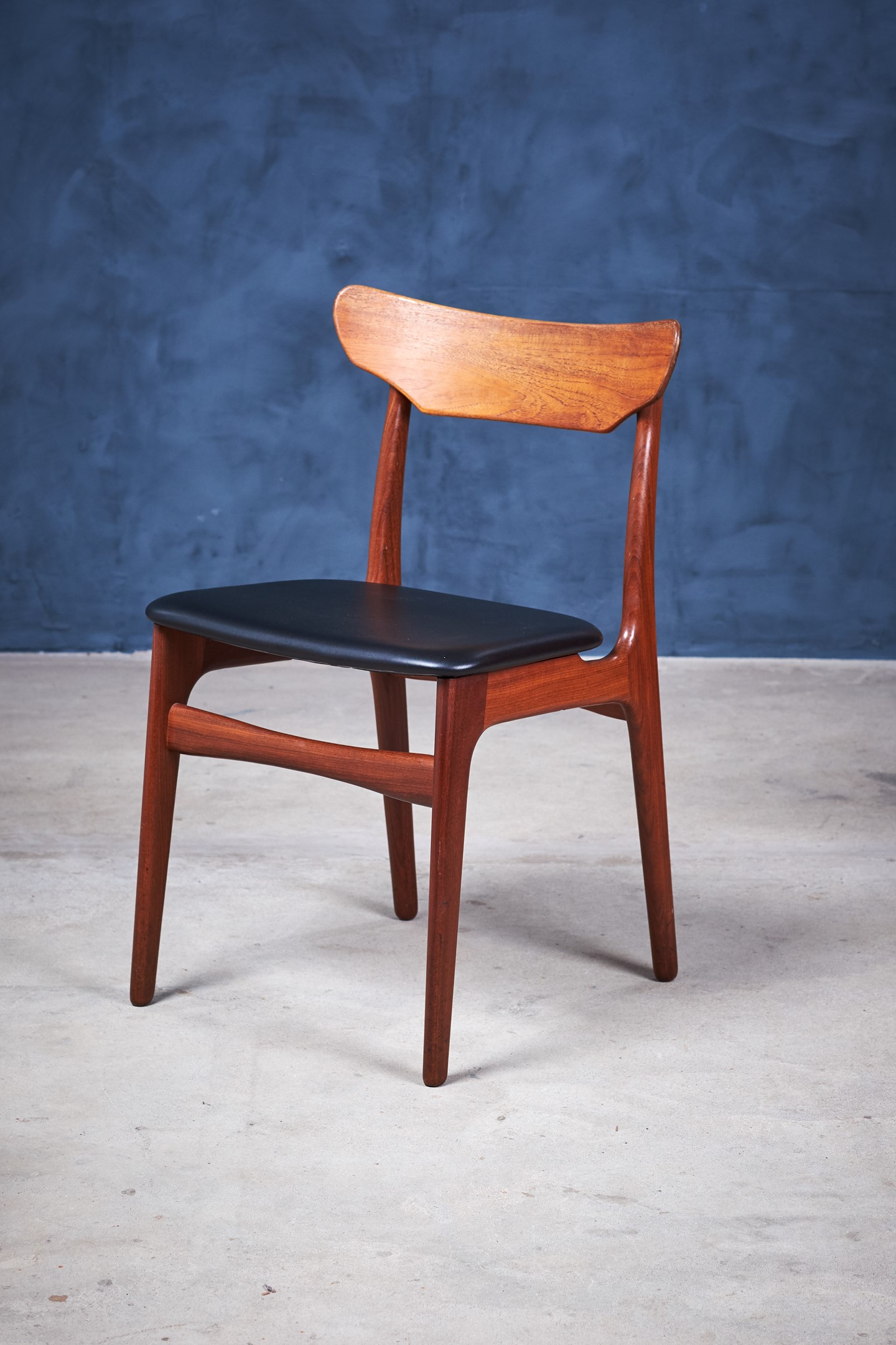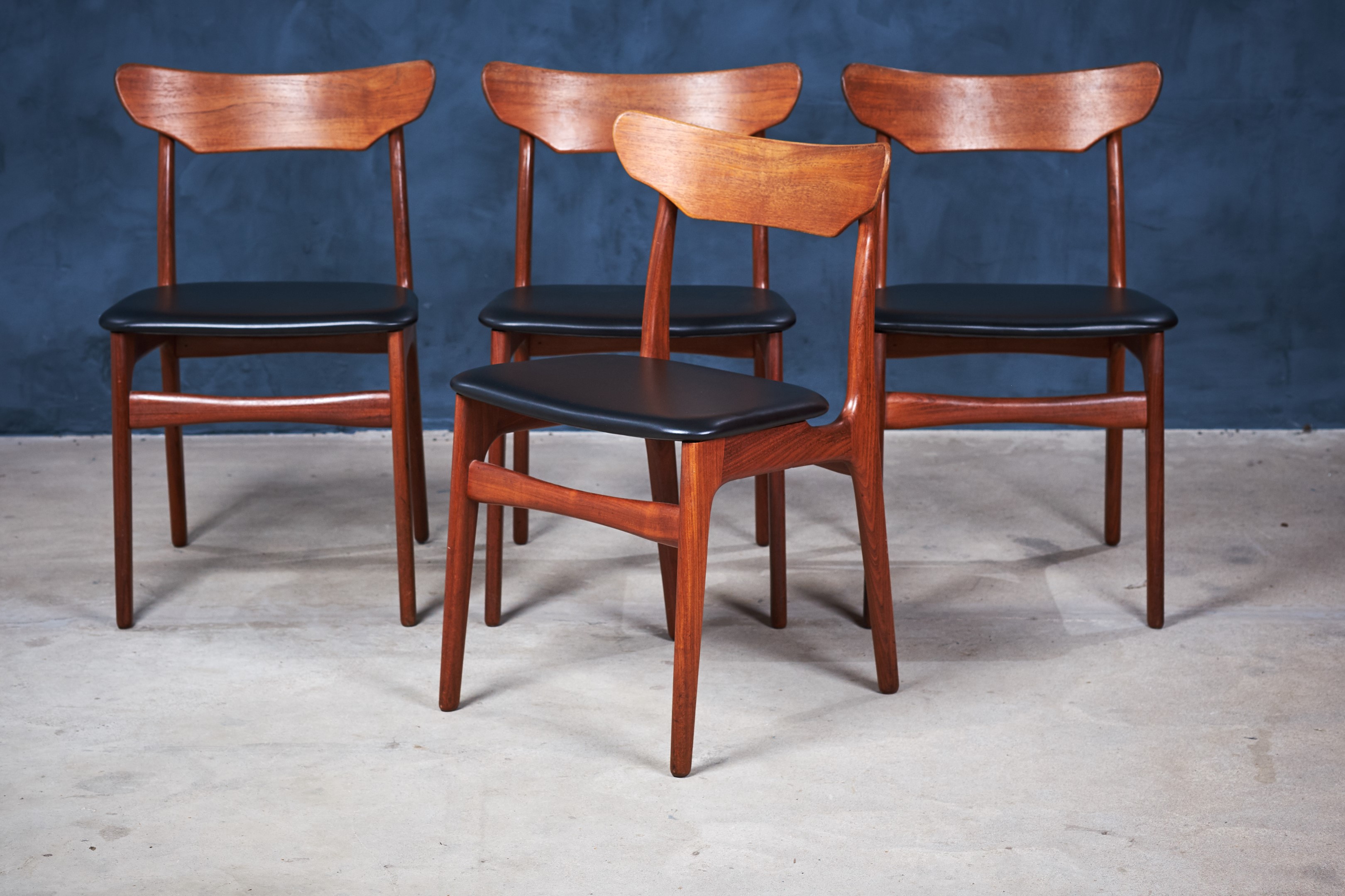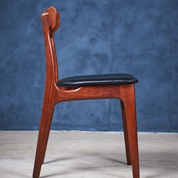 A set of 4 dining chairs designed by Schiønning & Elgaard for Randers Møbelfabrik. Produced in Denmark during the 1960s The frames are made of solid teak with sculptured backrests and the set has been reupholstered with artificial leather and new foam. The chairs are in very good vintage condition with only a few signs of age related use. 24 chairs are available, so if you prefer a bigger set that would be possible. This stunning set would be a great addition to any modern dining room environment