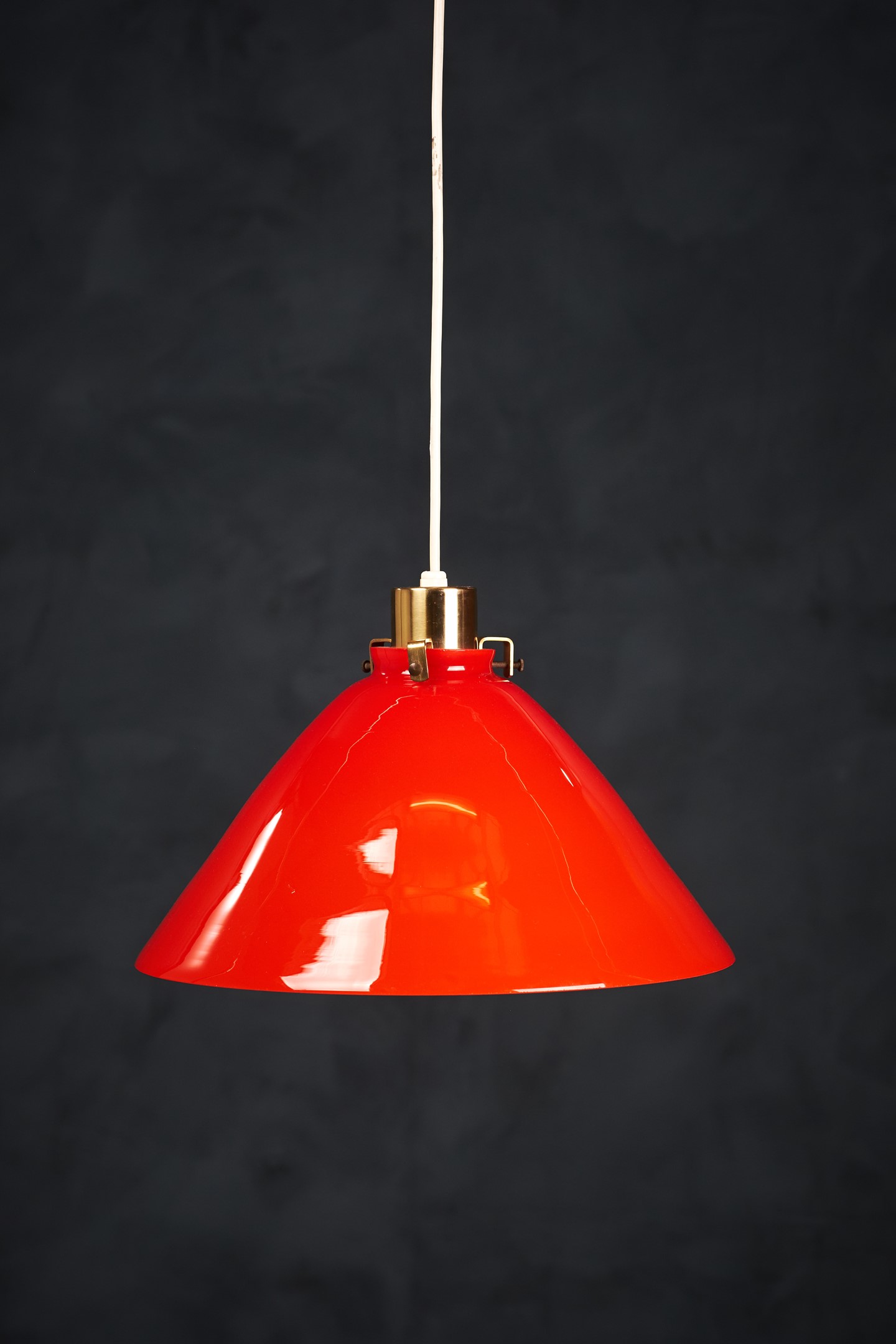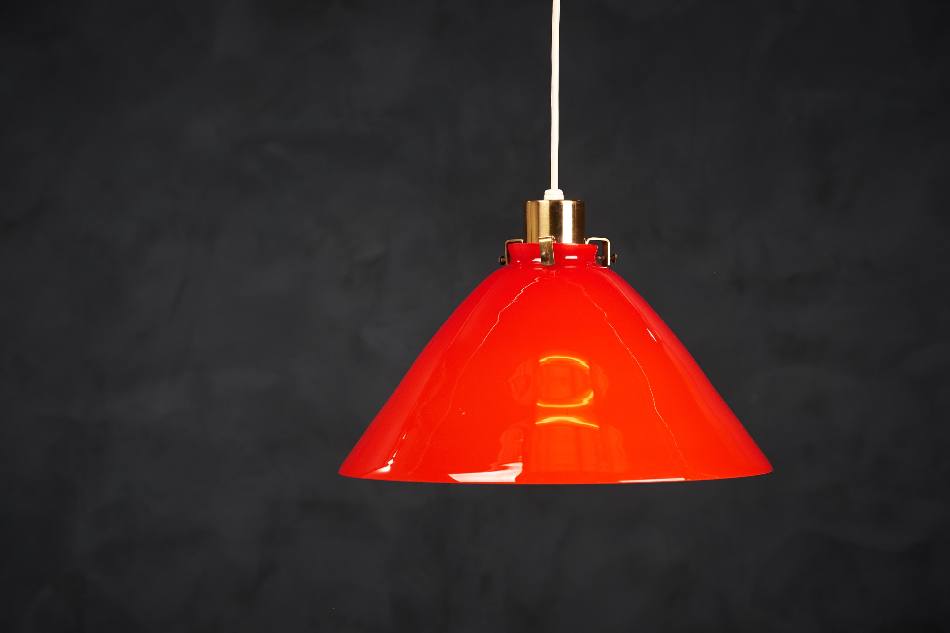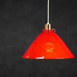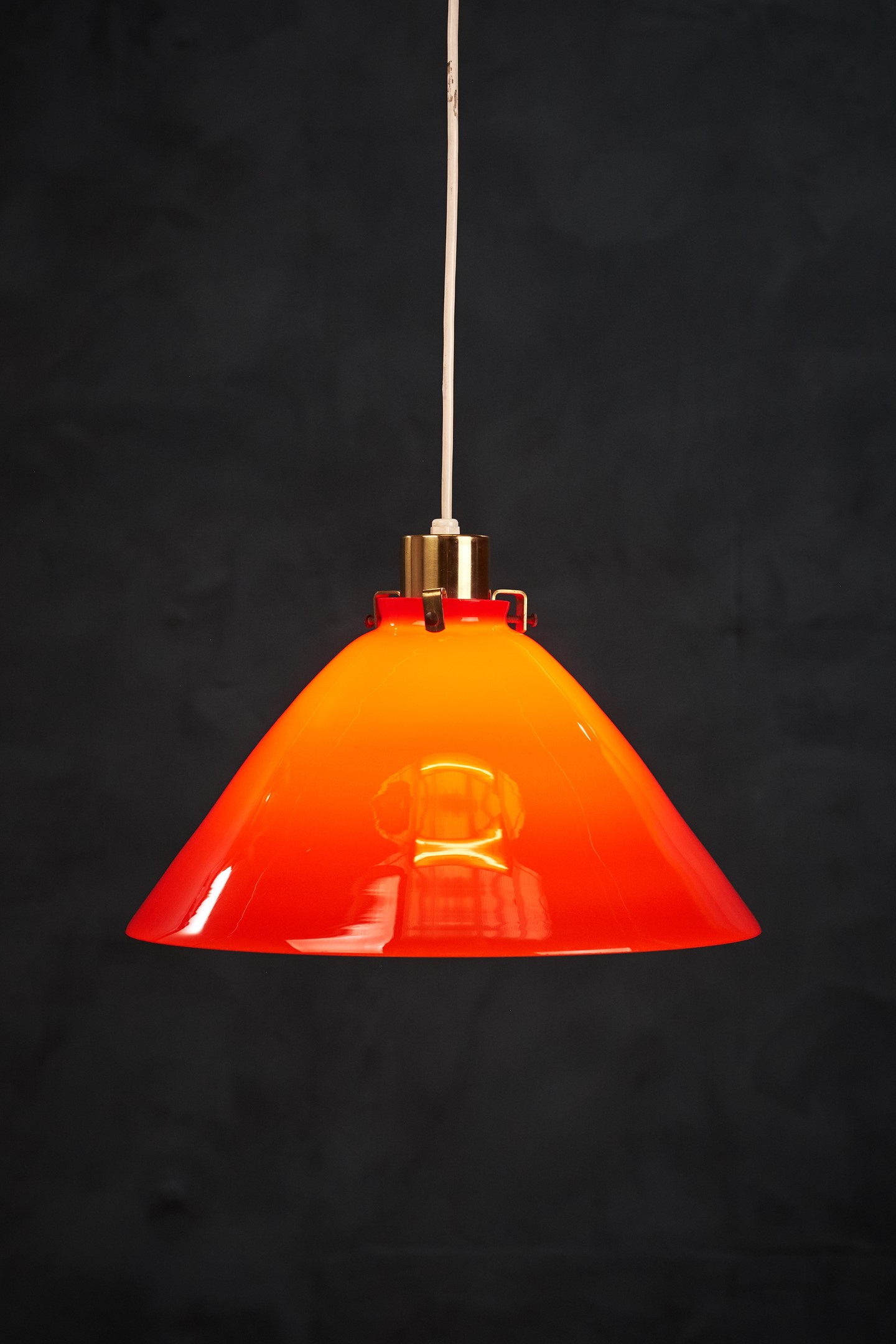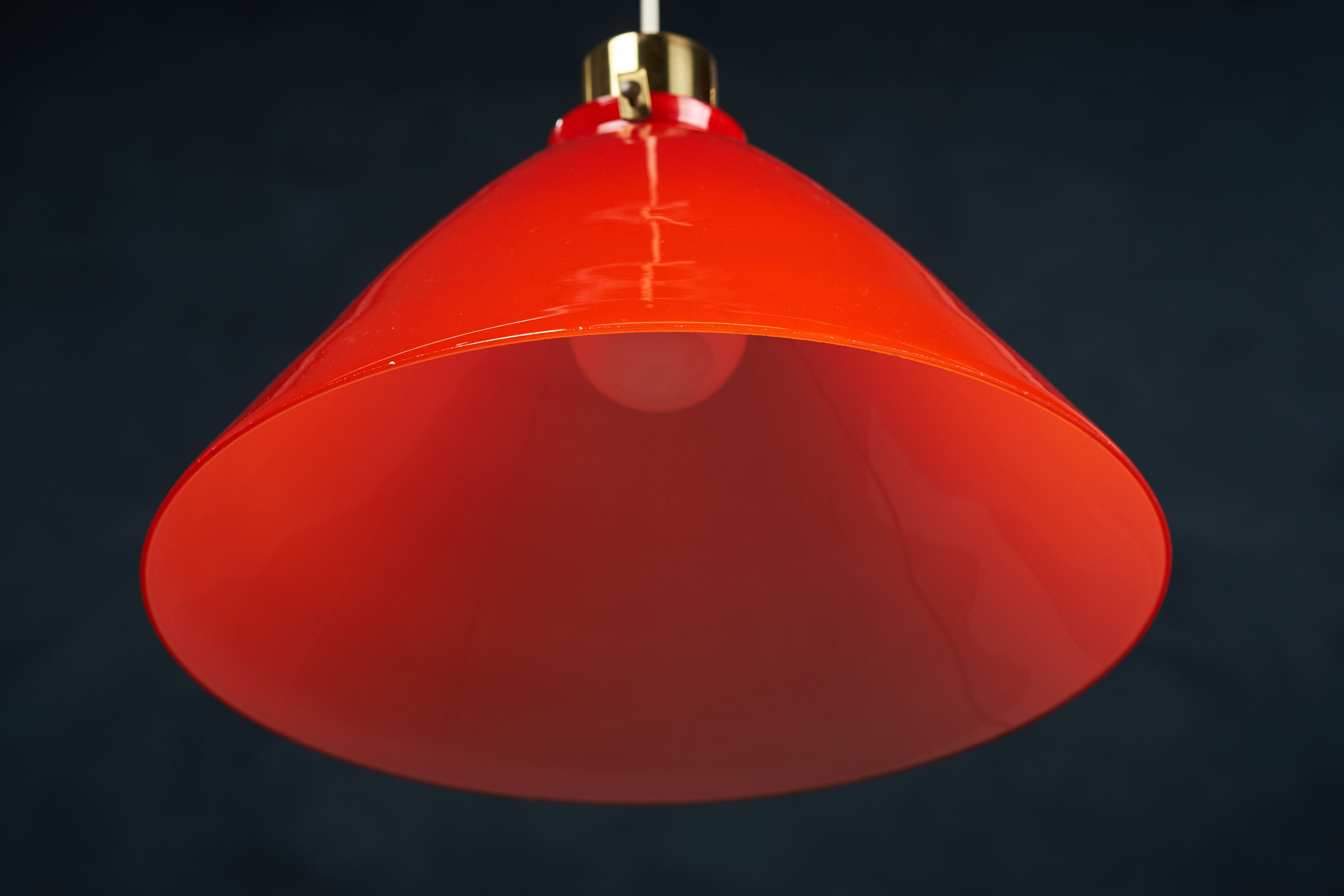This orange glass pendant lamp was designed in Denmark, circa 1970s. Top in brass. The style is reminiscent of Holmegaard. It would be a beautiful addition to any kitchen or dining table, or perhaps in a living space spreading a warm light. All original, but rewired with 2 m (6′ 6.7″) white plastic cord – for safety and beauty. Tested and fully functional. Cleaned, labeled and packed in protective plastic cover.