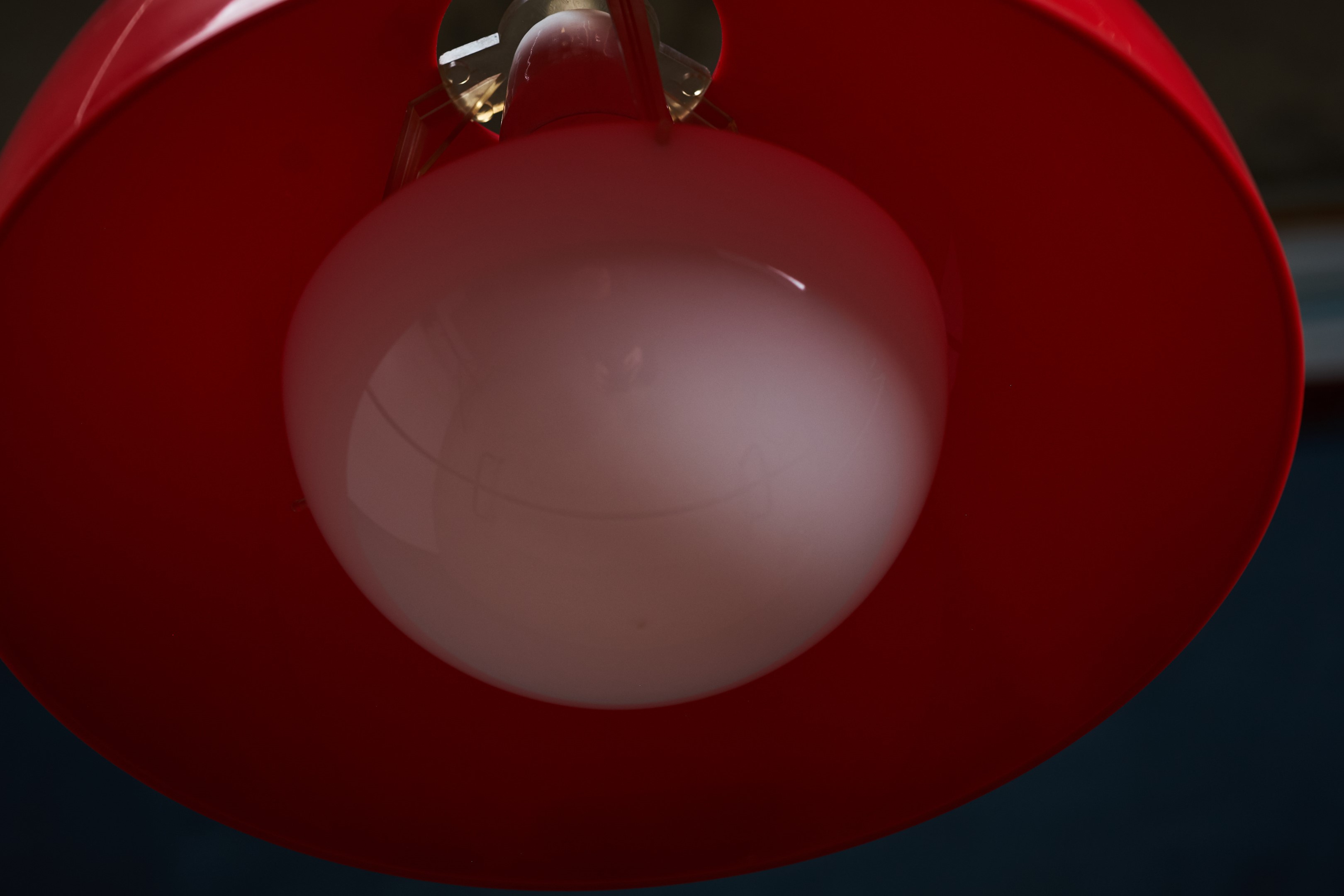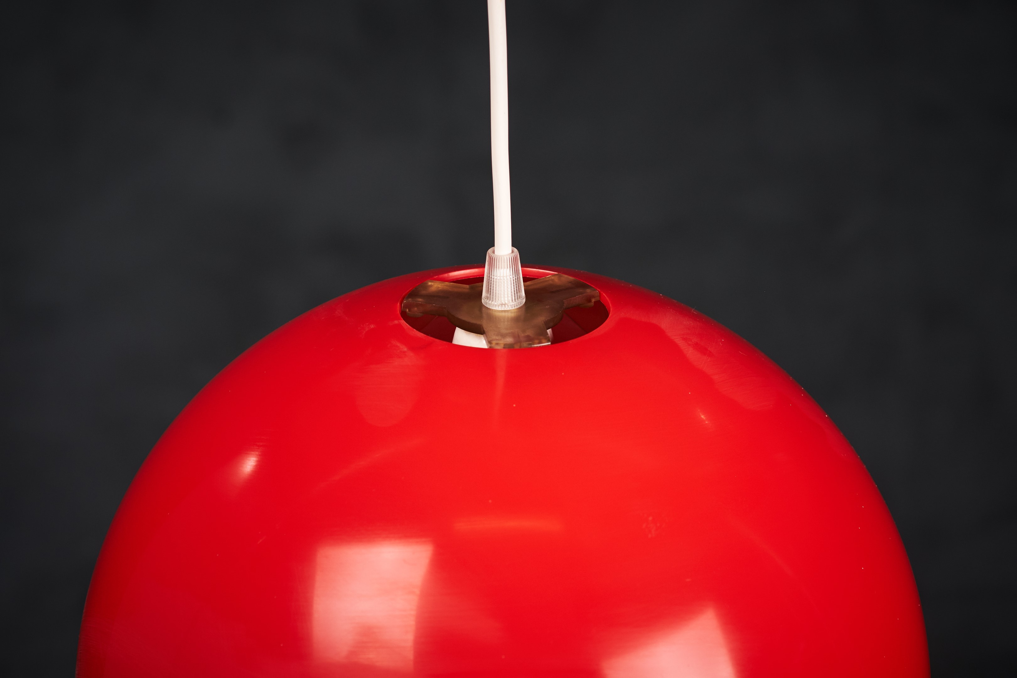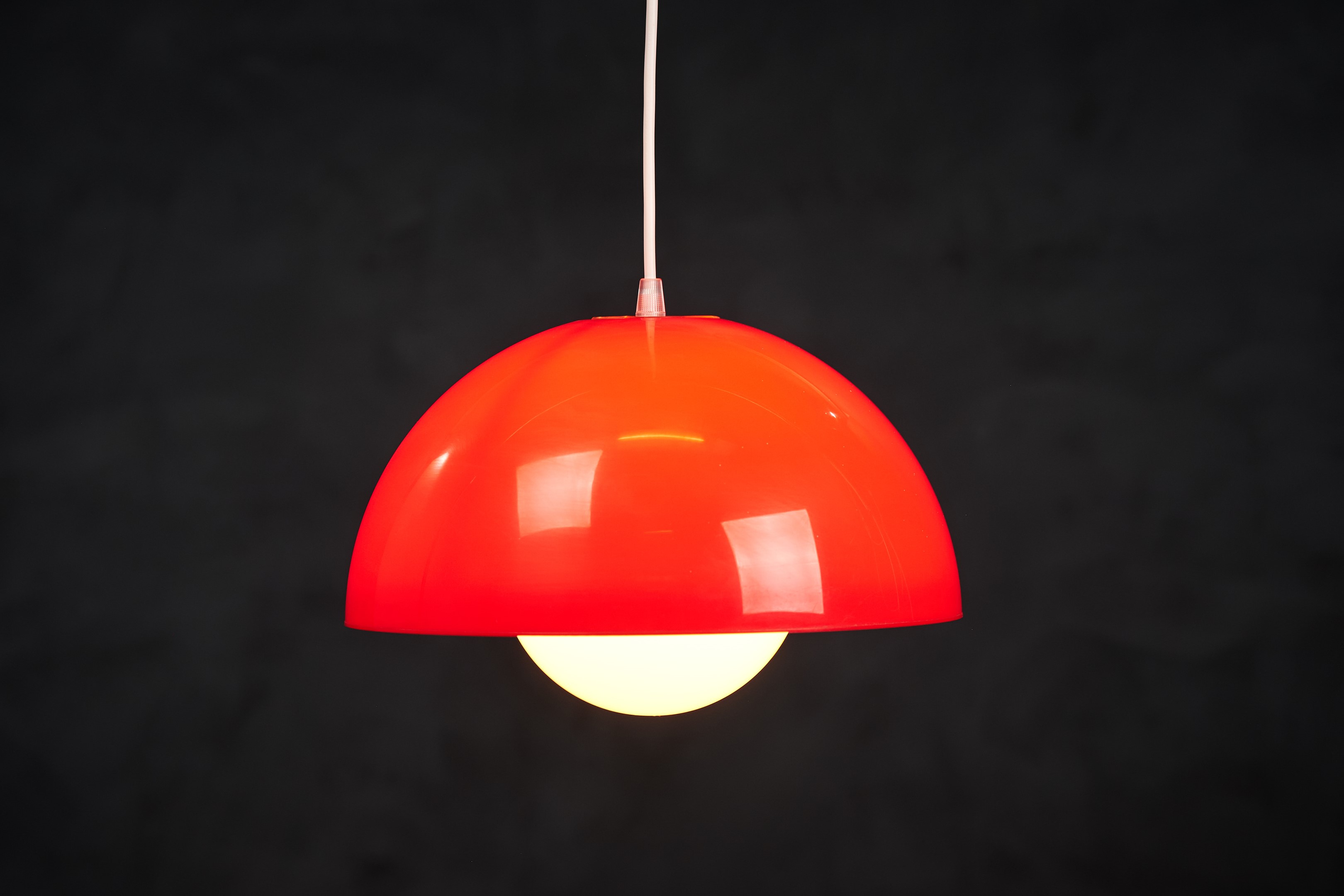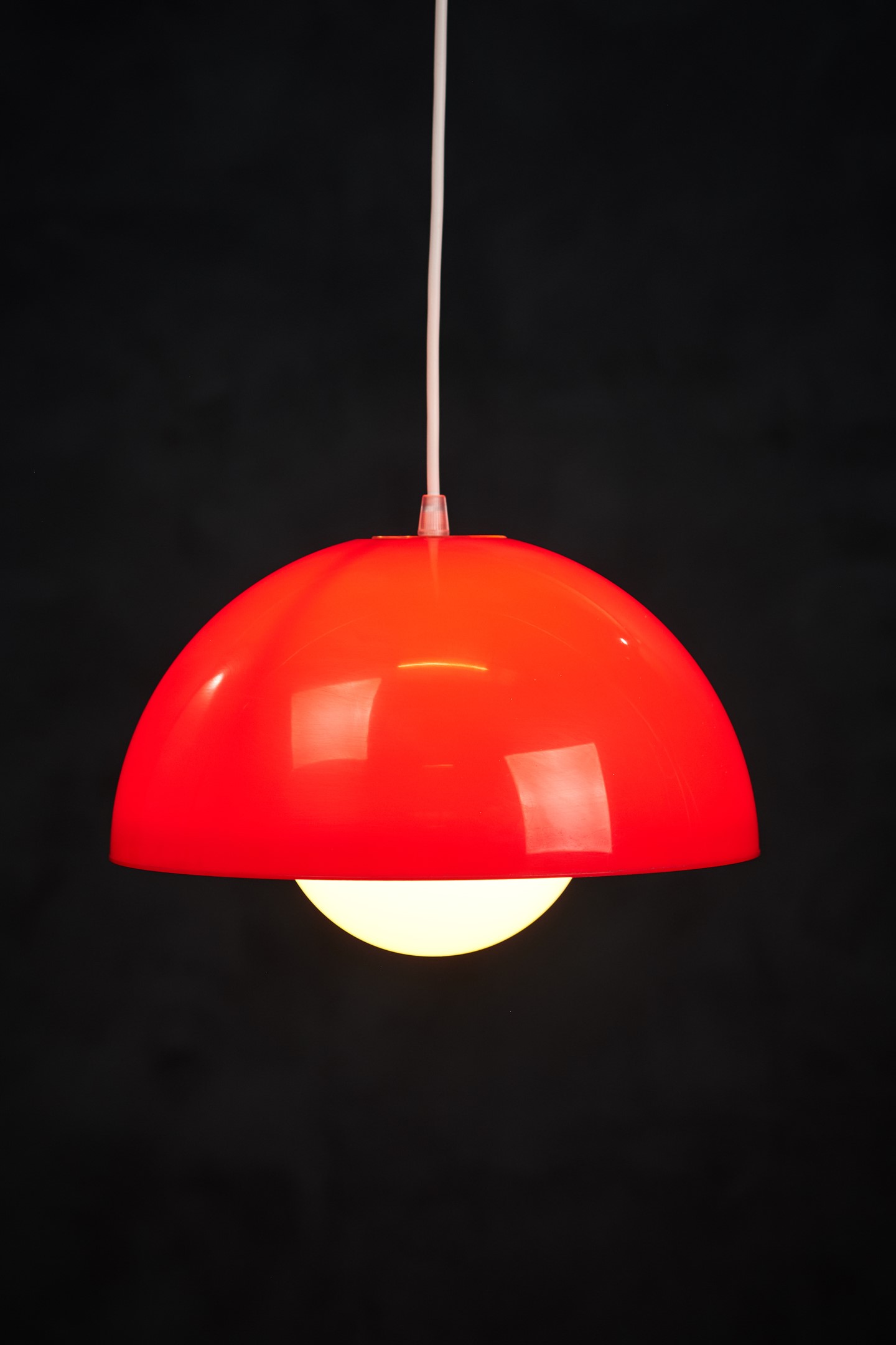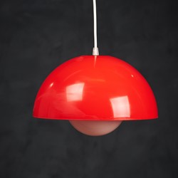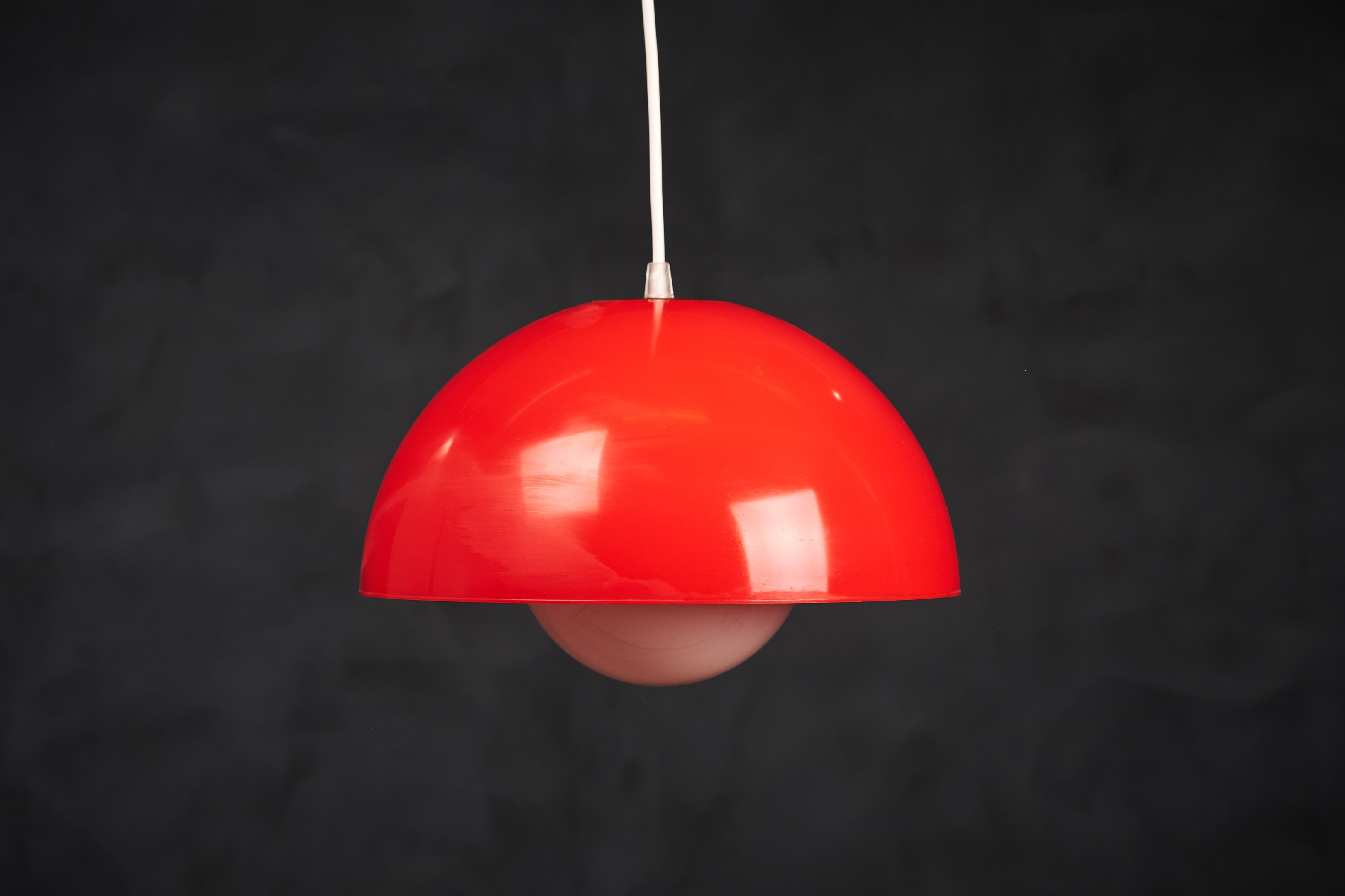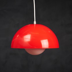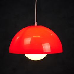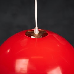 Beautiful red pendant lamp, Danish design, 1960s. The lamp is very similar to one of Verner Panton's flowerpots, just bigger. This pendant would be a beautiful addition to any dining table, or perhaps in a living space spreading a warm light. In good vintage condition with few small scratches. All original, but rewired with 2 m (6′ 6.7″) white plastic cord – for safety and beauty. Tested and fully functional. Cleaned, labeled and packed in protective plastic cover.