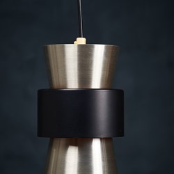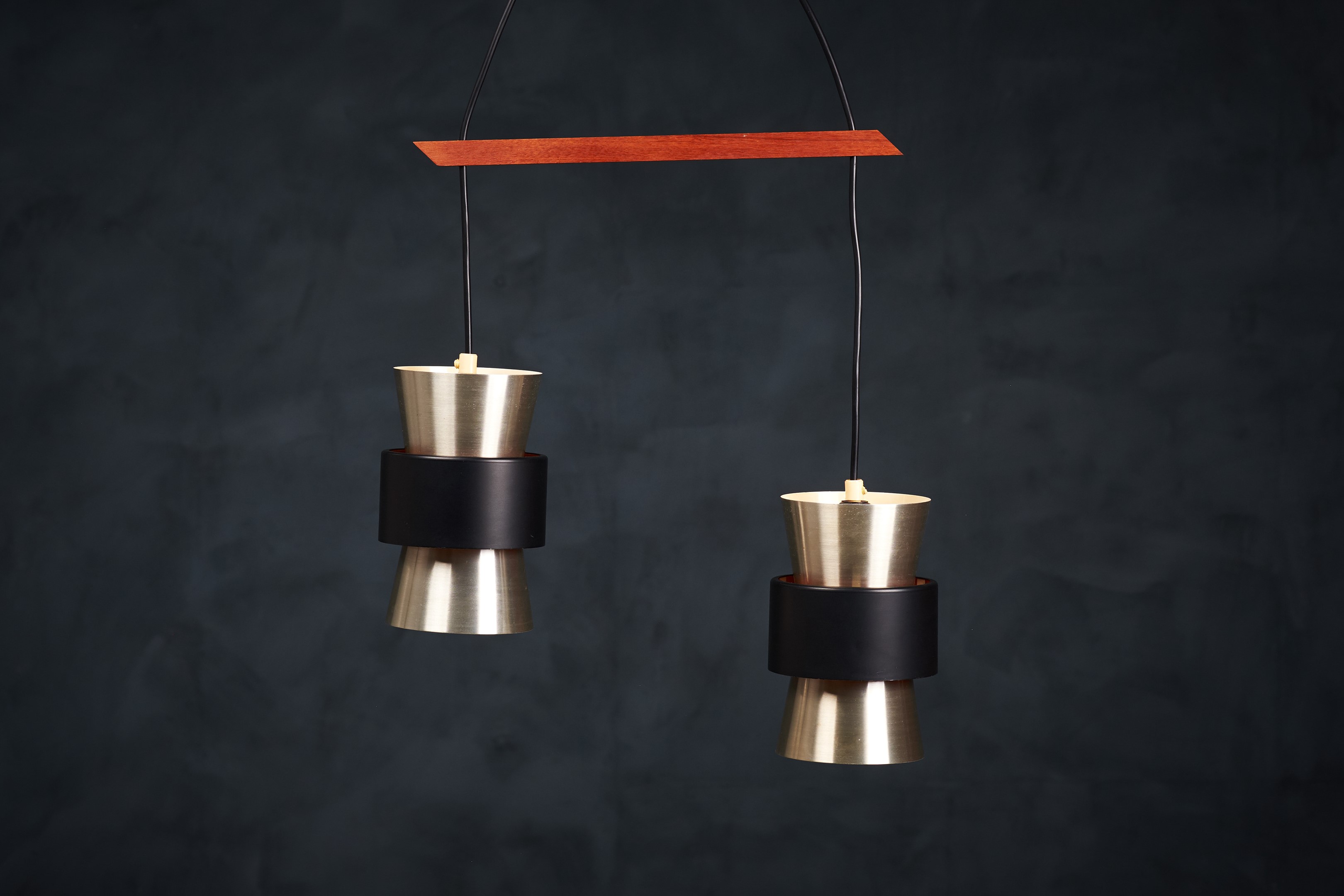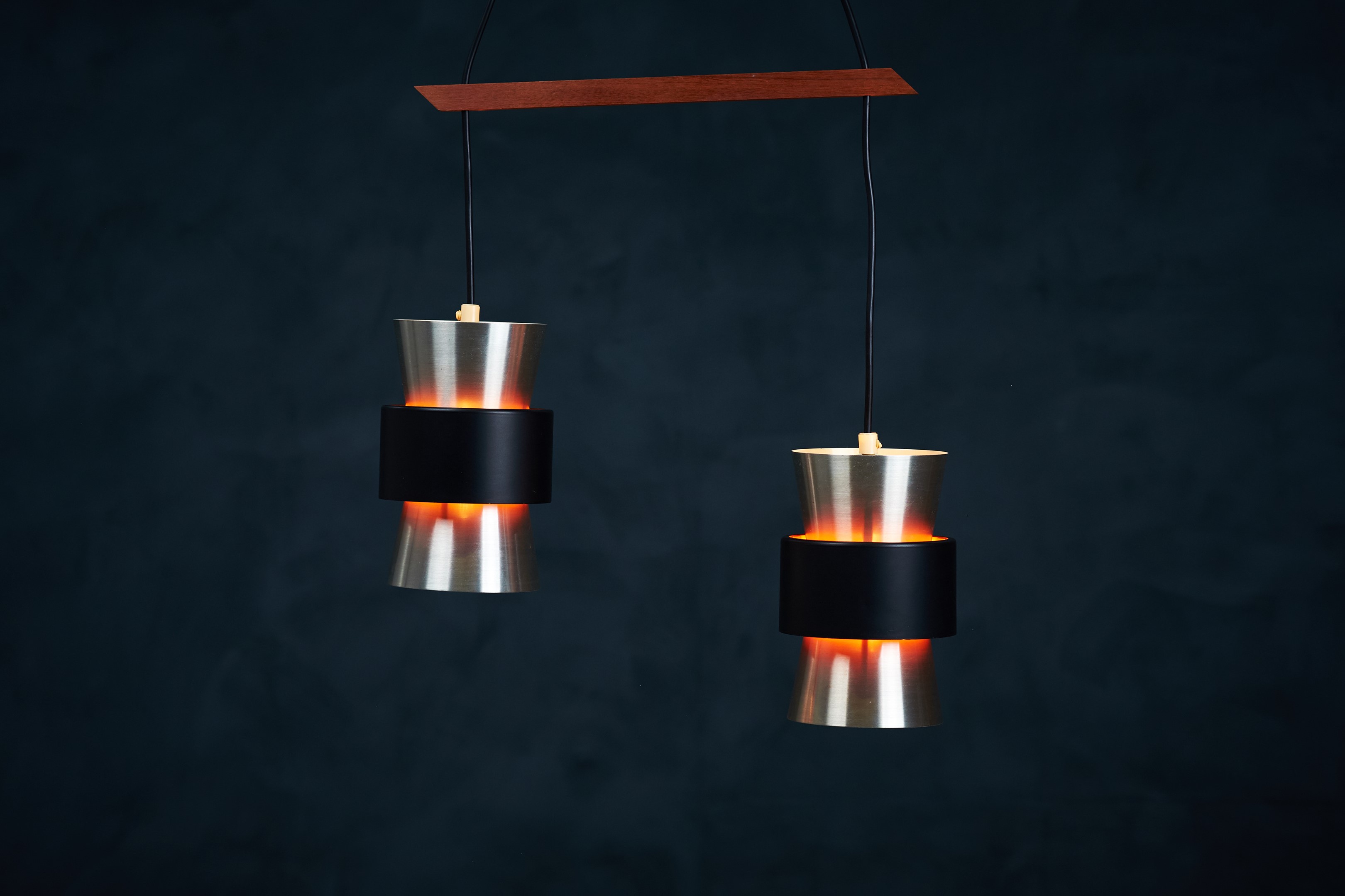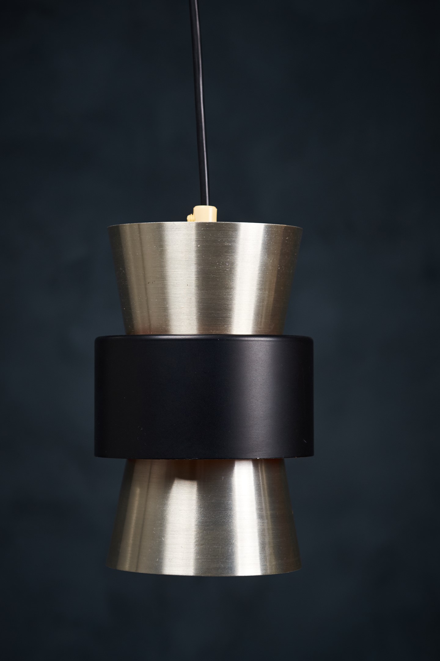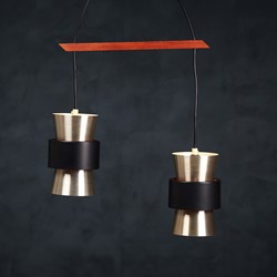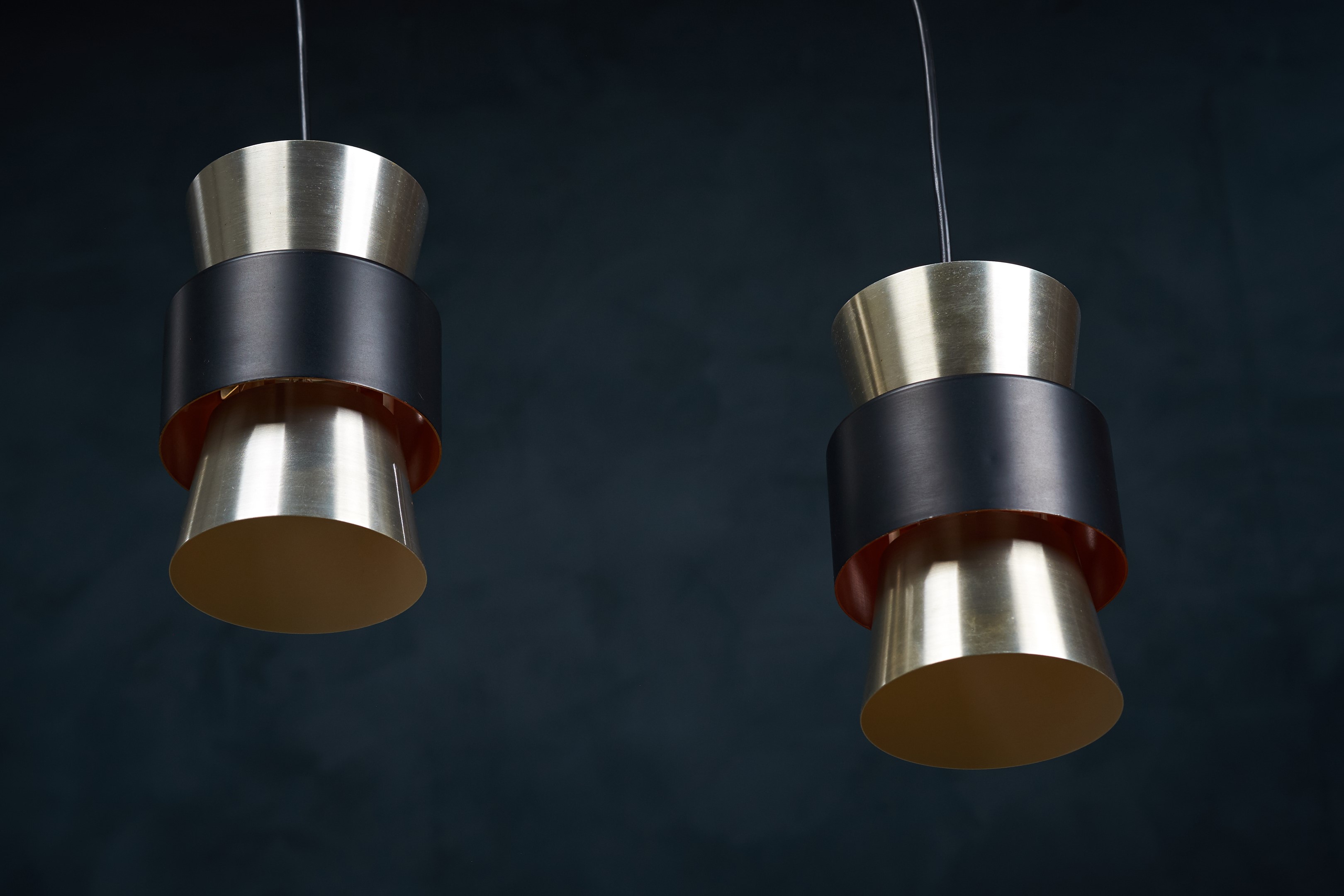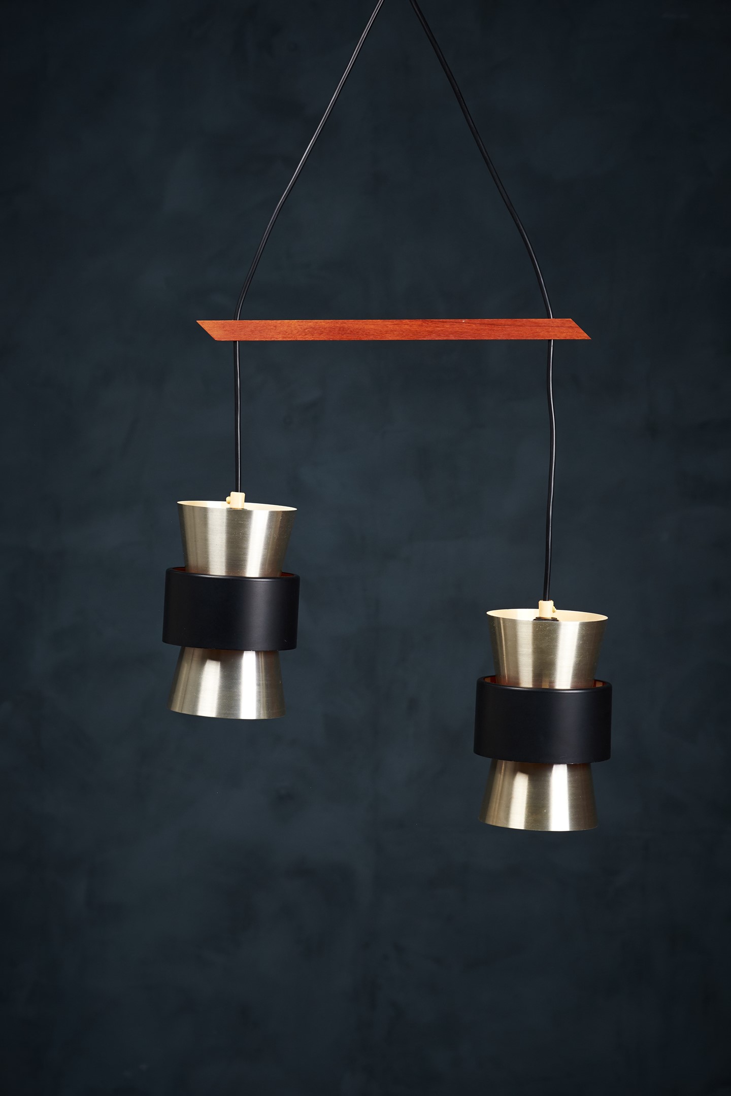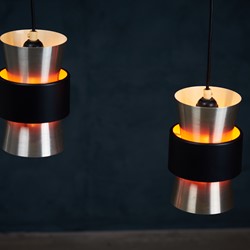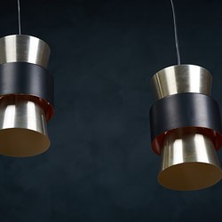 Pair of pendant lamps, Danish design, 1960s. Beautiful lamps in great vintage condition. The outer shade dimmers the light and throws it out in a fantastic way. It would be a beautiful addition to any lonely corner in the house or dining table, or perhaps in a living space spreading a warm light. All original, but rewired with 2 m (6′ 6.7″) black plastic cord – for safety and beauty. Tested and fully functional. Cleaned, labeled and packed in protective plastic cover.