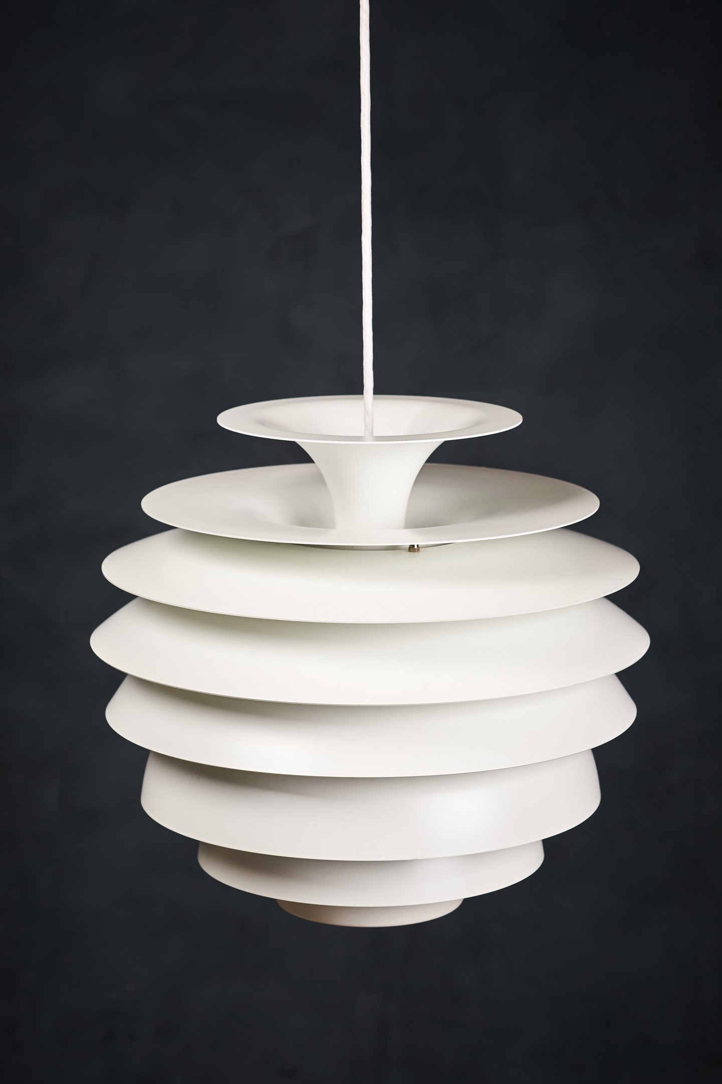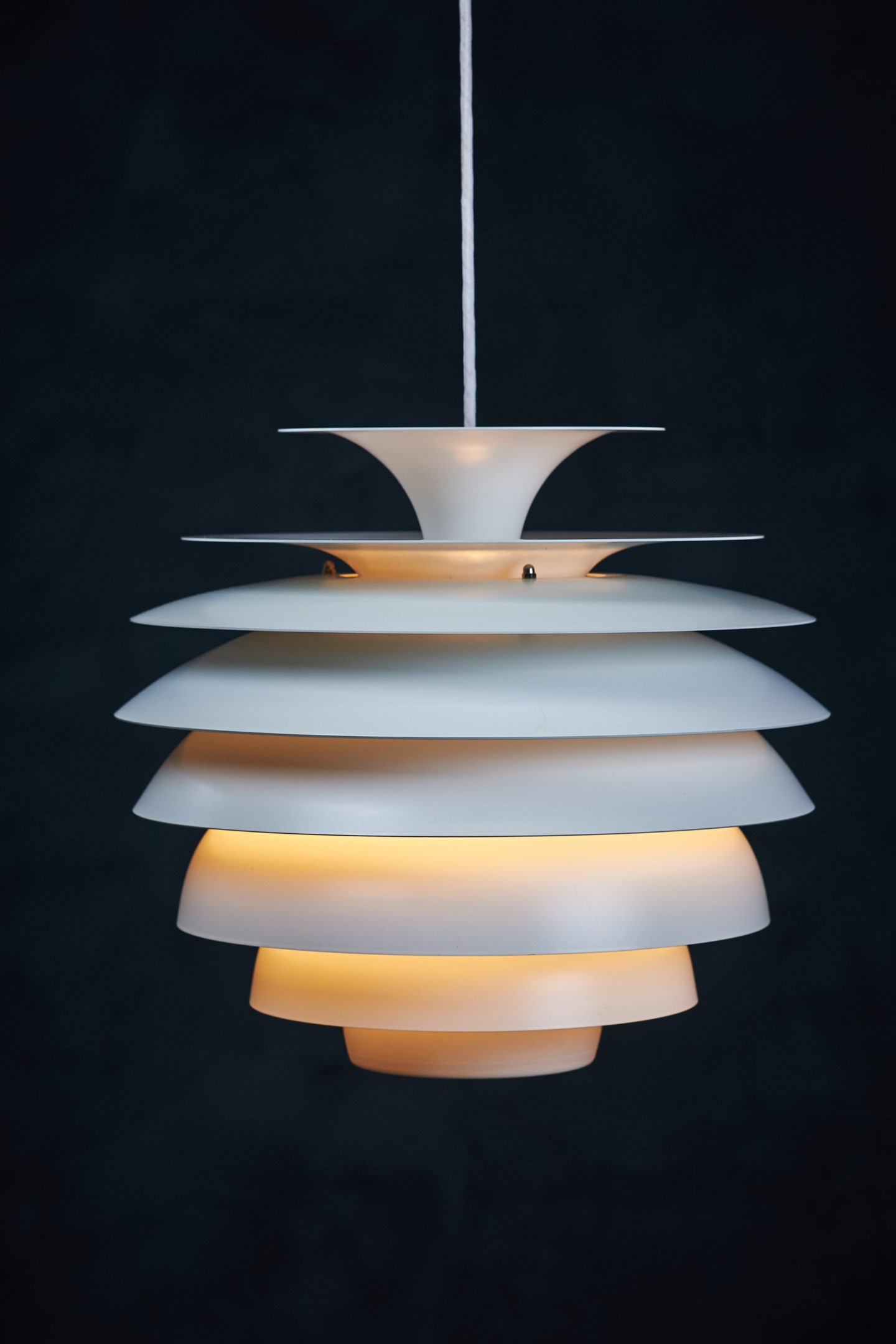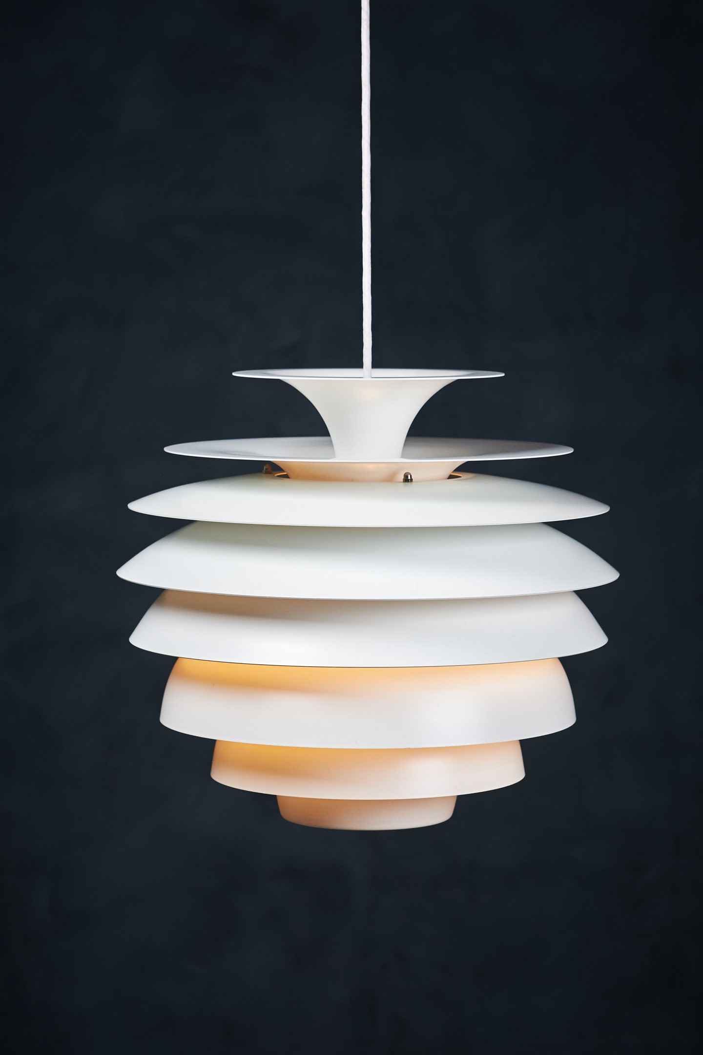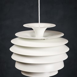 Beautiful Danish vintage “Barcelona” pendant designed by Bent Karlby for Lyfa. This impressive and very stylish lamp creates a nice atmosphere thanks to the light that shines through the white shades. The lamp is in a really perfect condition, completely straight, without scratches or any dents. This beauty would be a beautiful addition to any dining table, or perhaps in a living space spreading a warm light. Not hard to find a spot for. All original, but rewired with 2 m (6′ 6.7″) white plastic cord – for safety and beauty. Tested and fully functional.
