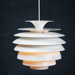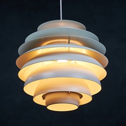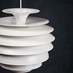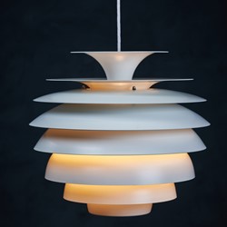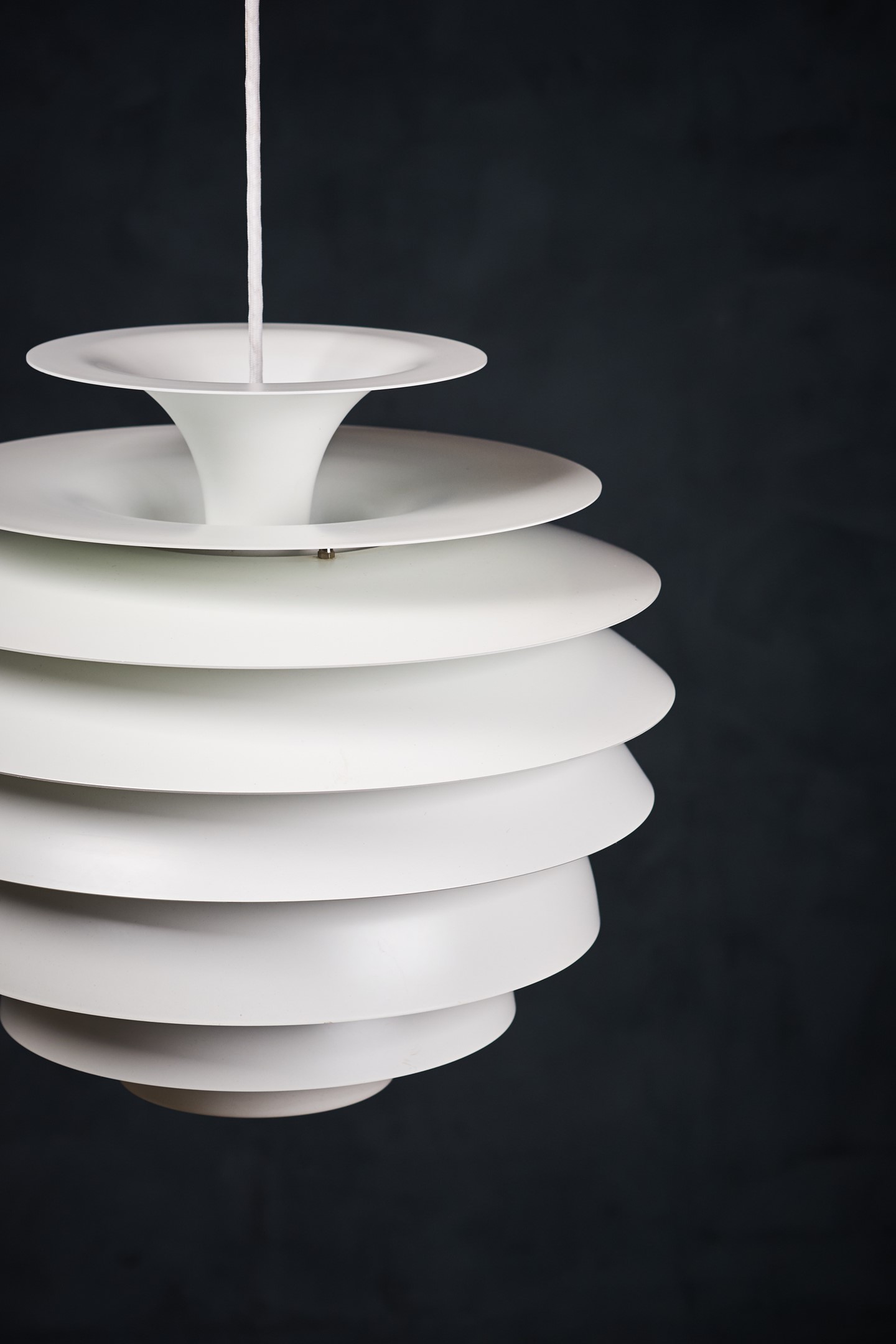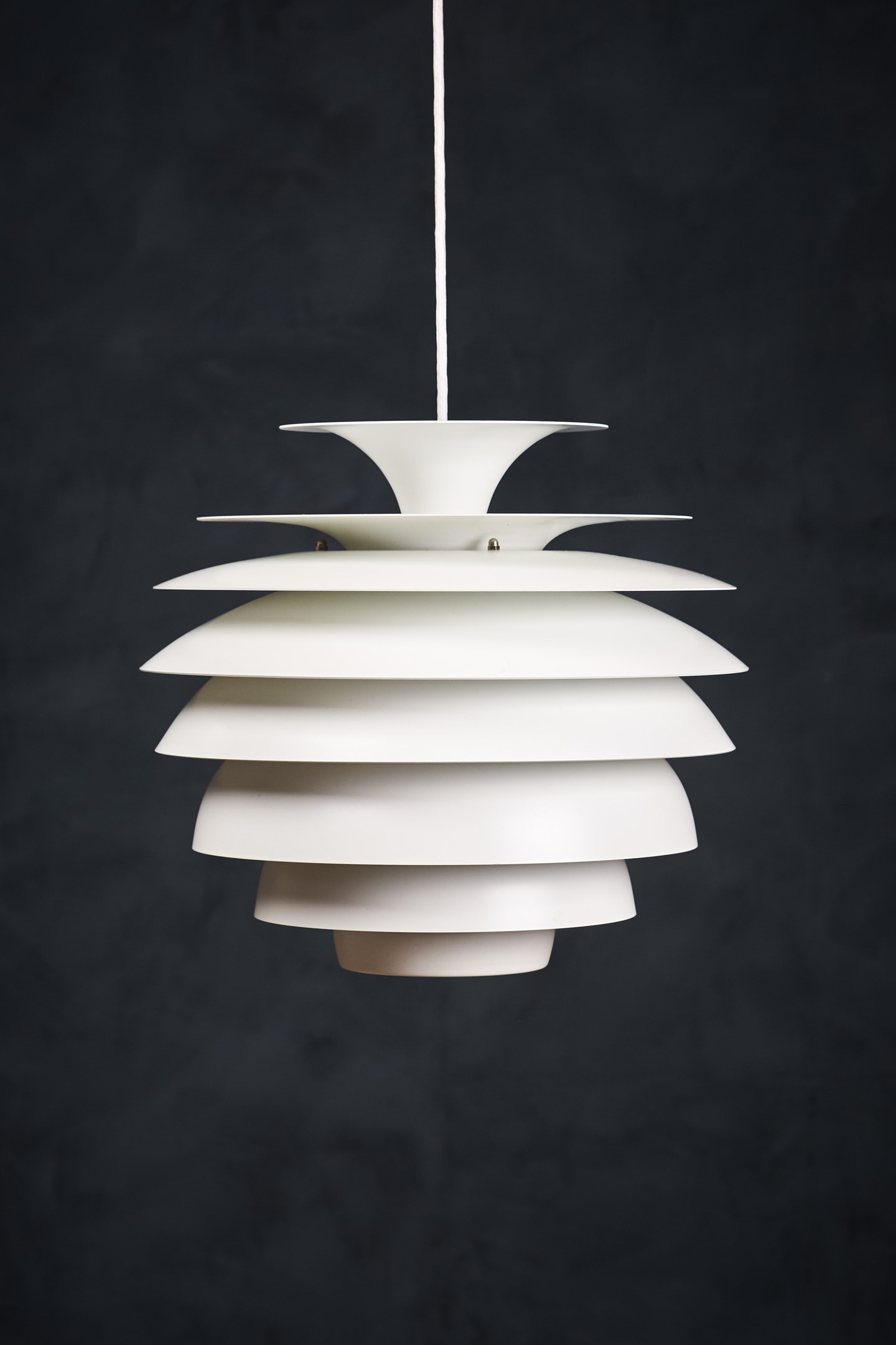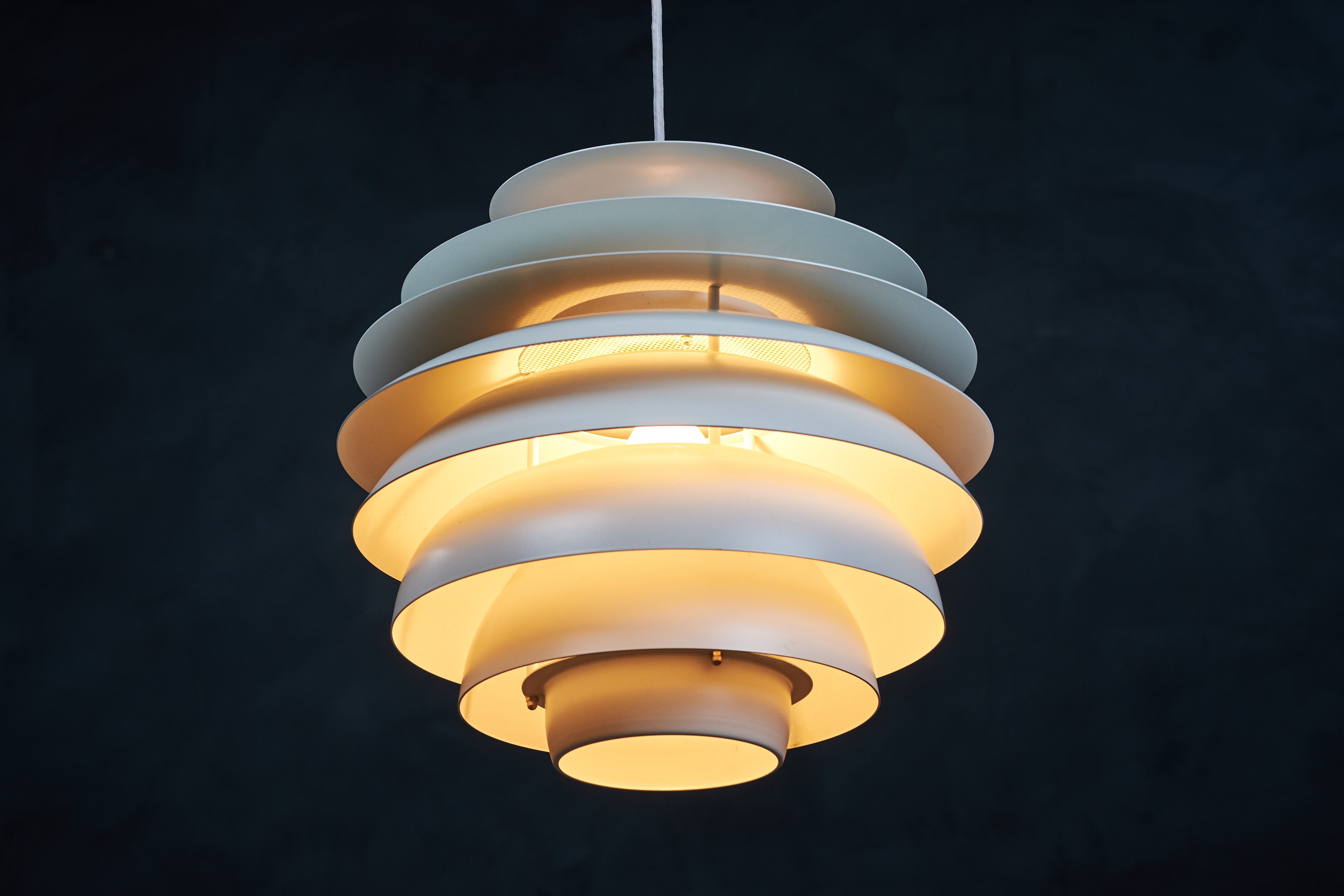 Beautiful Danish vintage “Barcelona” pendant designed by Bent Karlby for Lyfa. This impressive and very stylish lamp creates a nice atmosphere thanks to the light that shines through the white shades. The lamp is in a really perfect condition, completely straight, without scratches or any dents. This beauty would be a beautiful addition to any dining table, or perhaps in a living space spreading a warm light. Not hard to find a spot for. All original, but rewired with 2 m (6′ 6.7″) white plastic cord – for safety and beauty. Tested and fully functional.