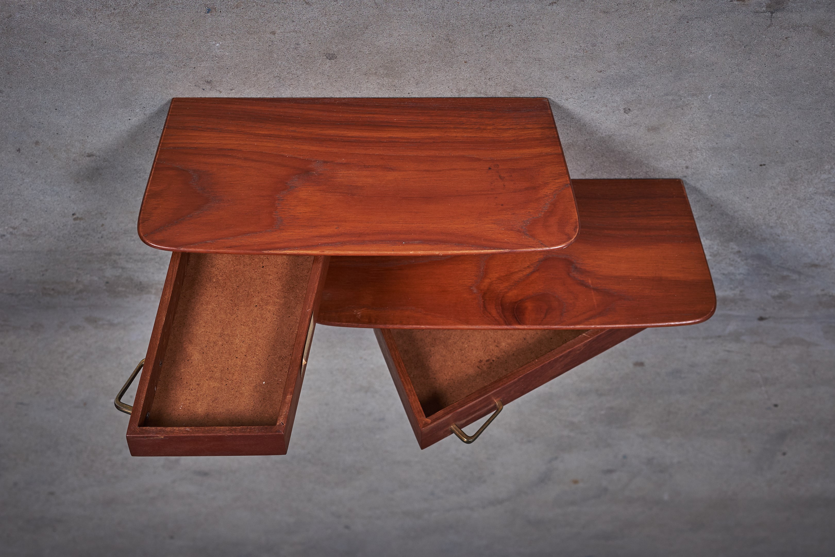 A pair of teak wall mountable floating nightstands. Made in Denmark, circa 1960. Unusual design and in great vintage condition. Very light and elegant design. If you prefer the item will polished and shined before shipping.