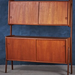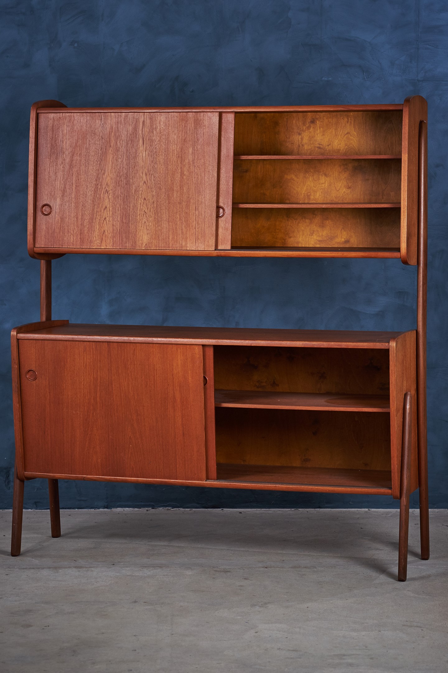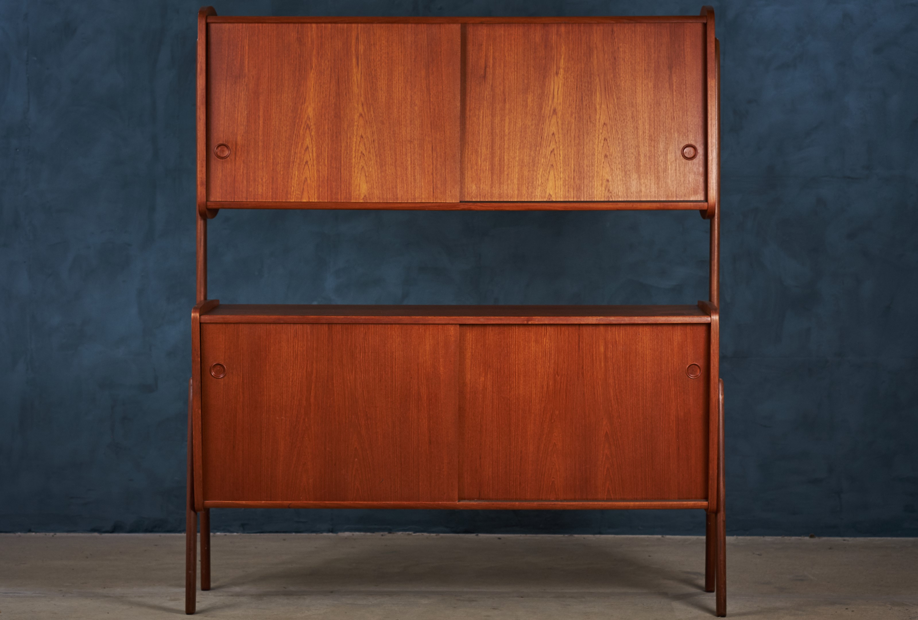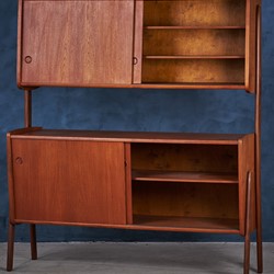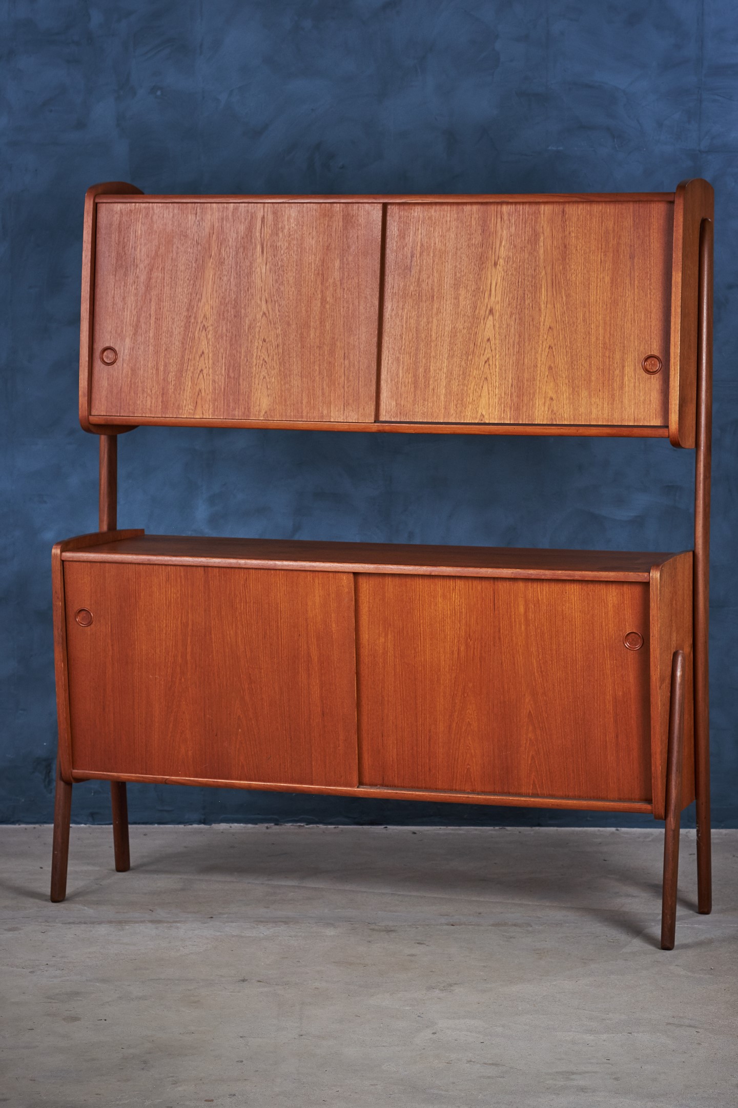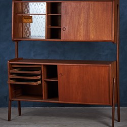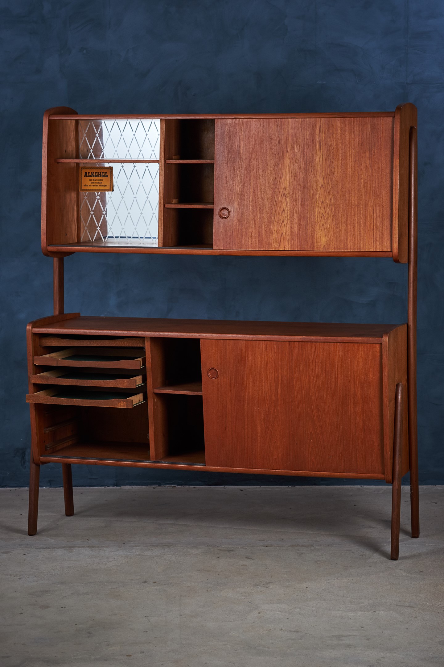 Beautiful double high board in teak with great storage room and a bar with glass in the top from the 1960s in Denmark. This is a very beautiful furniture in good quality and in good vintage condition. It would be a great addition to most modern environments.
