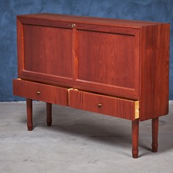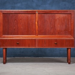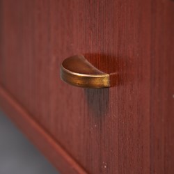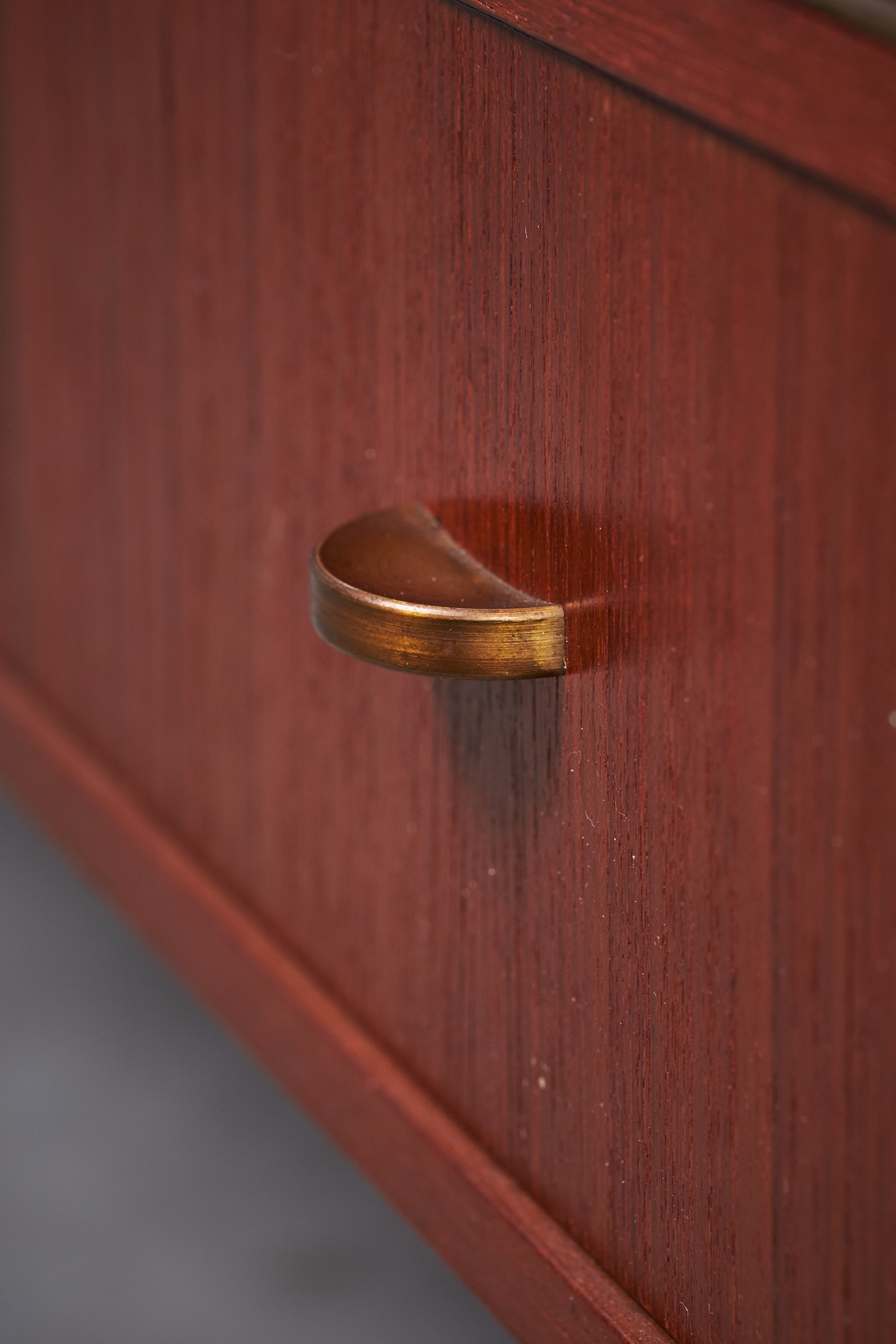Stunning petit entryway/livingroom cabinet in teak with 2 drawers with brass handles and good storage room behind the tilting door. This size of furnitures make it easy to find a spot in your home or in the narrow entrance. Very light and elegant design with some beautiful details. This cabinet would make a great addition to any modern homes.